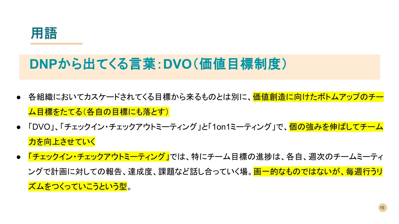 2021年4月からDNP価値目標制度(DVO制度)というMBOにOKR的要素を組み入れた目標管理の制度を開始しました。具体的には、価値創造に向けてトップダウン目標だけではなくボトムアップのチーム目標も立て、1on1やチェックイン・チェックアウト(CICO)ミーティングと3点セットでまわしていくことによって、一人ひとりの強みを伸ばすとともにチームの力を最大限に高めていくことを目的としています。ミーティングのやり方については、それぞれのチームや課に裁量を持たせているので、皆さんのヒントになるのではと思います。
