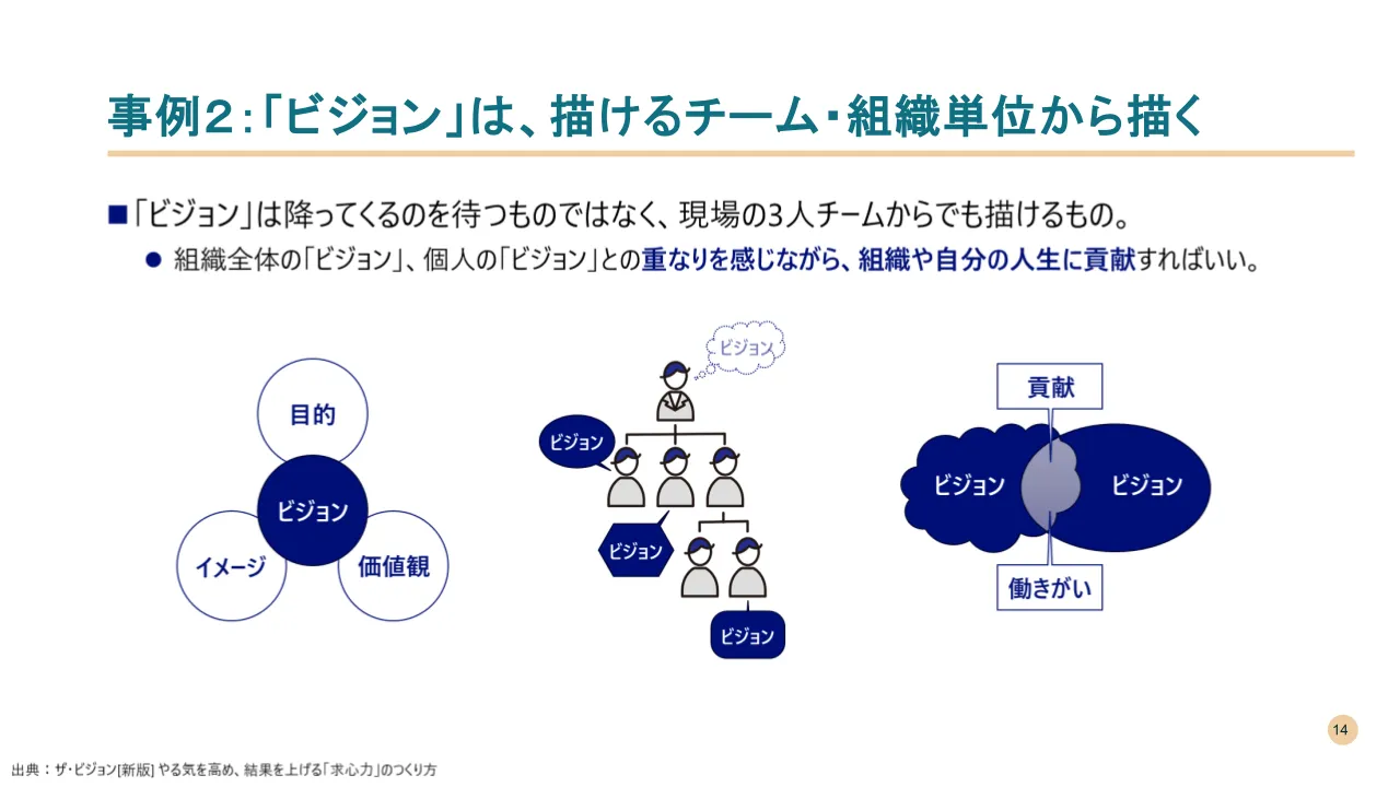 2つ目は、描けるチーム・組織単位から描く「ビジョン」です。ここでは、ビジョンとは経営や会社のトップから降ってくるのを待つものではなくて、現場の3人のチームからでも描けるものだということを強調しています。つまりは、組織全体のビジョンと個人のビジョンとの重なりを感じながら、自分や自分の人生、組織に貢献できるような活動ができれば良いということです。例えば、経営のビジョンが降りてきた時に、現場の人間から「現場のことが分かってない」「こんなビジョンを描いても出来ないんじゃないか」というような声が挙がる場合がありますが、各チームで自分たちのビジョンを描けていれば経営のビジョンとの重なりを感じることができるので、そういった不満の声は出にくくなります。皆さんにも是非、「所属しているチームの仕事の目的は〇〇だから、こういう未来を描きたい」といったビジョンを描いてみていただけたらと思っております。