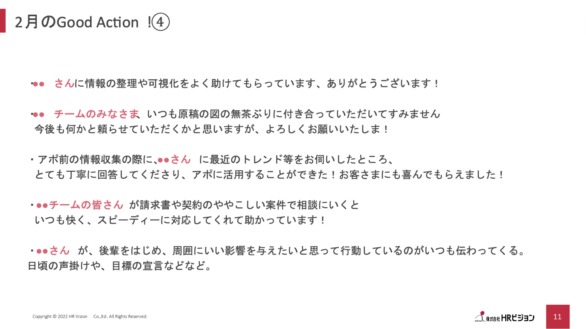 時間をかけているのは、サーベイの最後に設置した「Good Action!」というフリーコメント項目の内容紹介です。Good Action!とは、他の従業員の良い行動への称賛を書いてもらう項目です。毎回、結構な数をあげていただいているので、これを1つ1つ提示して、皆さんに共有しています。その時々でトピックが違うので、全てを取り上げることは難しいのですが、私からコメントも加えています。