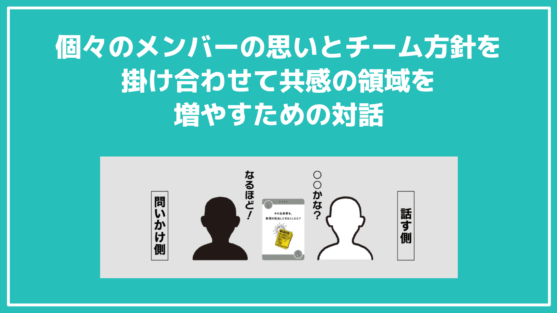 まず、「シセイカード」でマネージャーの聞く姿勢を決めることで、その場の傾聴姿勢が決まるため、ヒアリングに注力することができます。さらに、「トイカケカード」によって問う内容が指定されることで、様々な切り口で問いかけることができ、メンバーの発話量を増やして思いや本音を引き出しやすくなります。