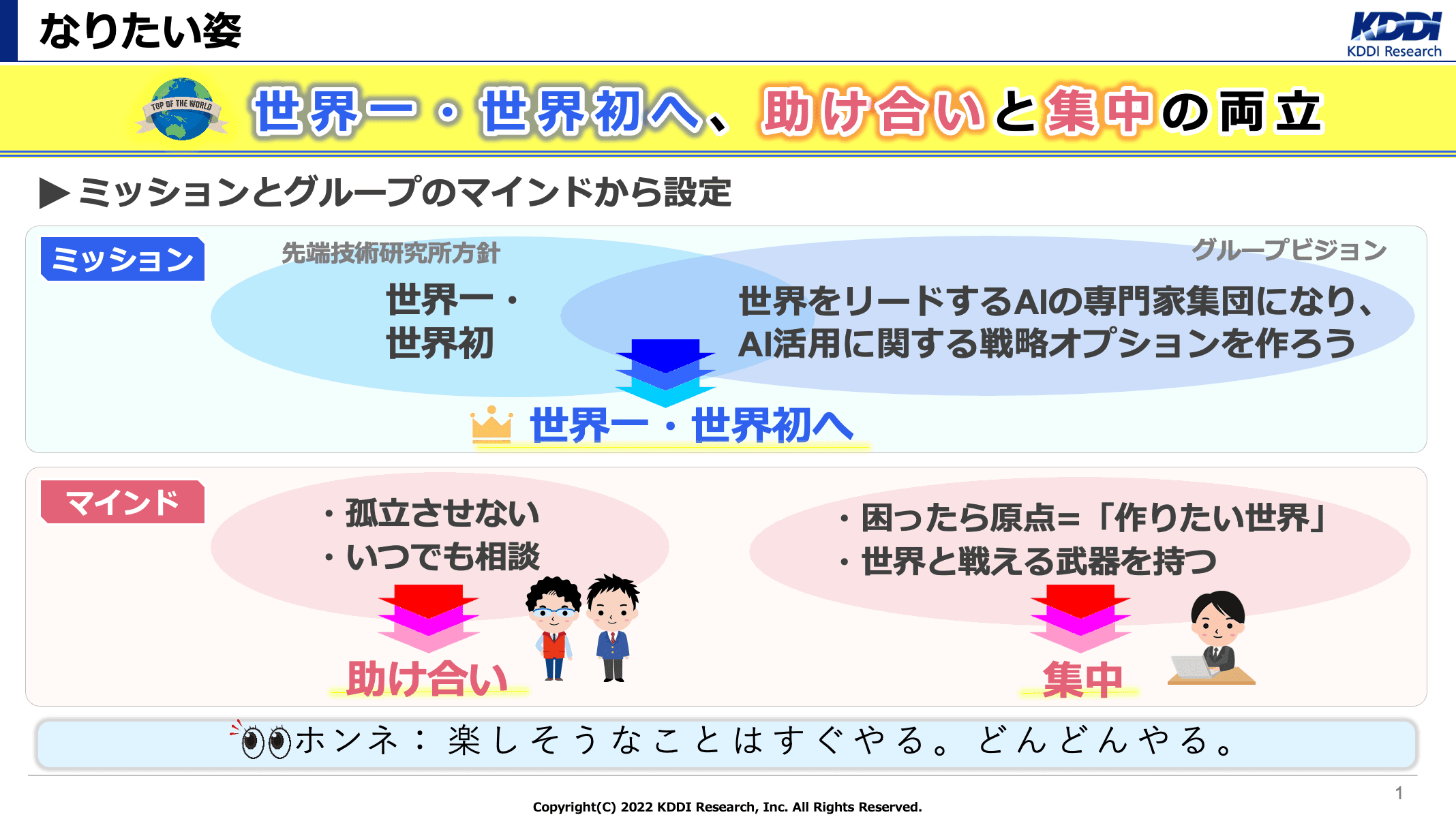黒川:当社は研究所ですから、「世界一・世界初」の実現が目指したいところになります。ただ、先端技術は日進月歩で追いつくだけでも大変。みんなで助け合いながら、なおかつ集中する時間も確保すべくやっていこうと思った時に、大変だからこそ、それを楽しくやりたいと思っていました。だから「楽しそうなことはすぐやる。どんどんやる」という組織を目指して、様々な取り組みをしていました。