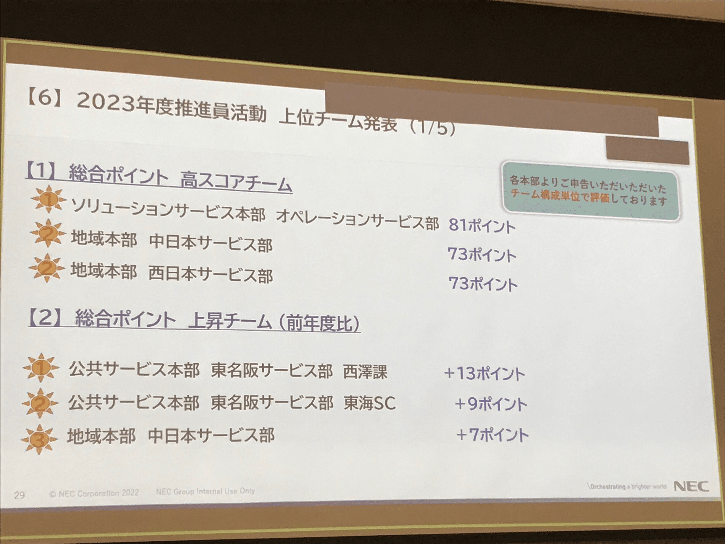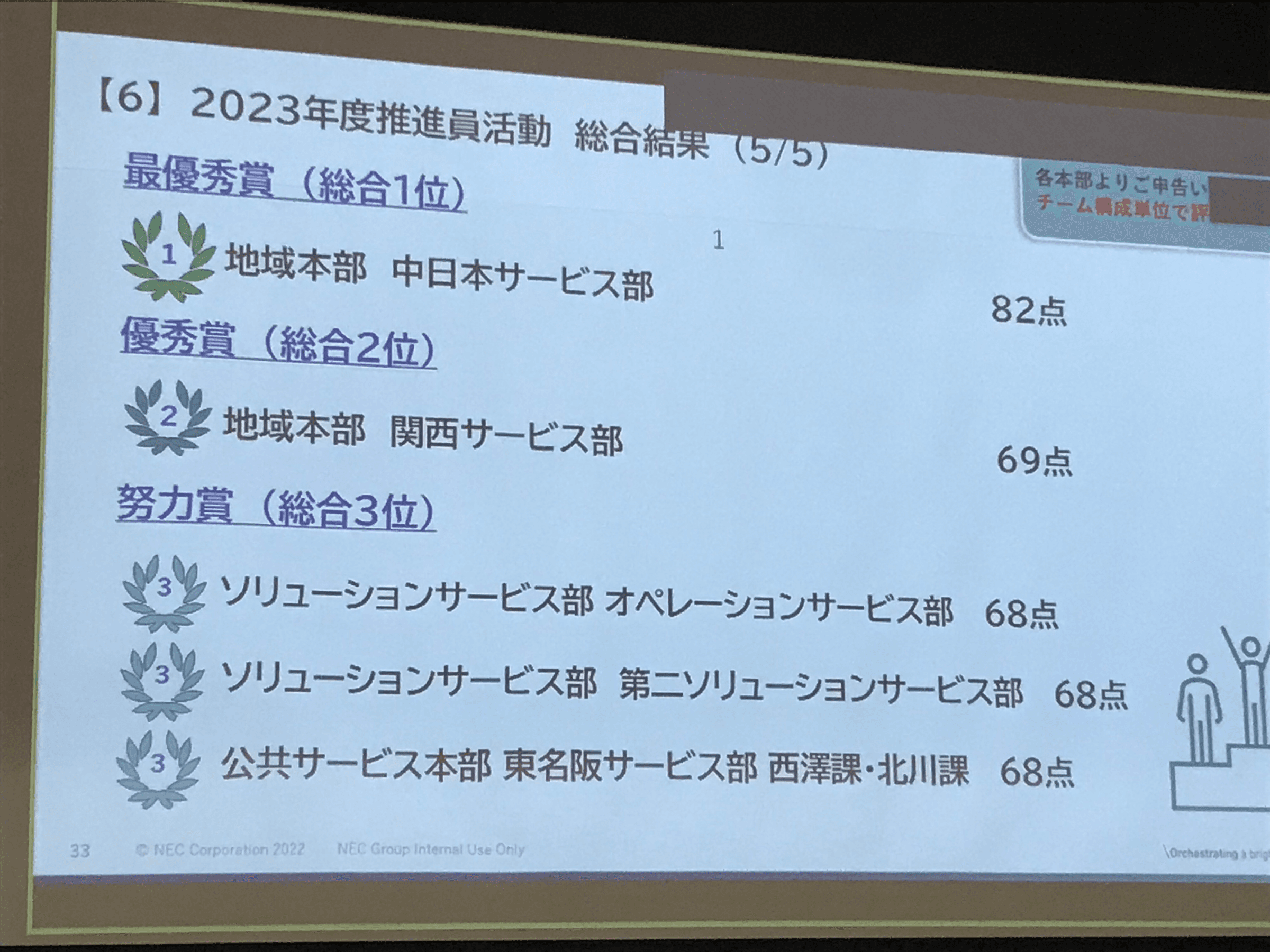 柳澤:推進員投票では、毎月のエンゲージメント推進員会議で、各チーム半期に1回ずつ発表した活動内容の中から、各推進員が良いと思った活動に投票しました。この結果と、「チームのWevoxのスコア」「前年からのスコアの伸び」「活動報告書の年間提出件数」「Wevoxのコメント欄に前向きなコメントやアイデアが記載された数」という4つの評価観点を元にチームごとに採点し、総合点が高いチームから順に「最優秀賞」「優秀賞」「努力賞」と順位づけしました。
