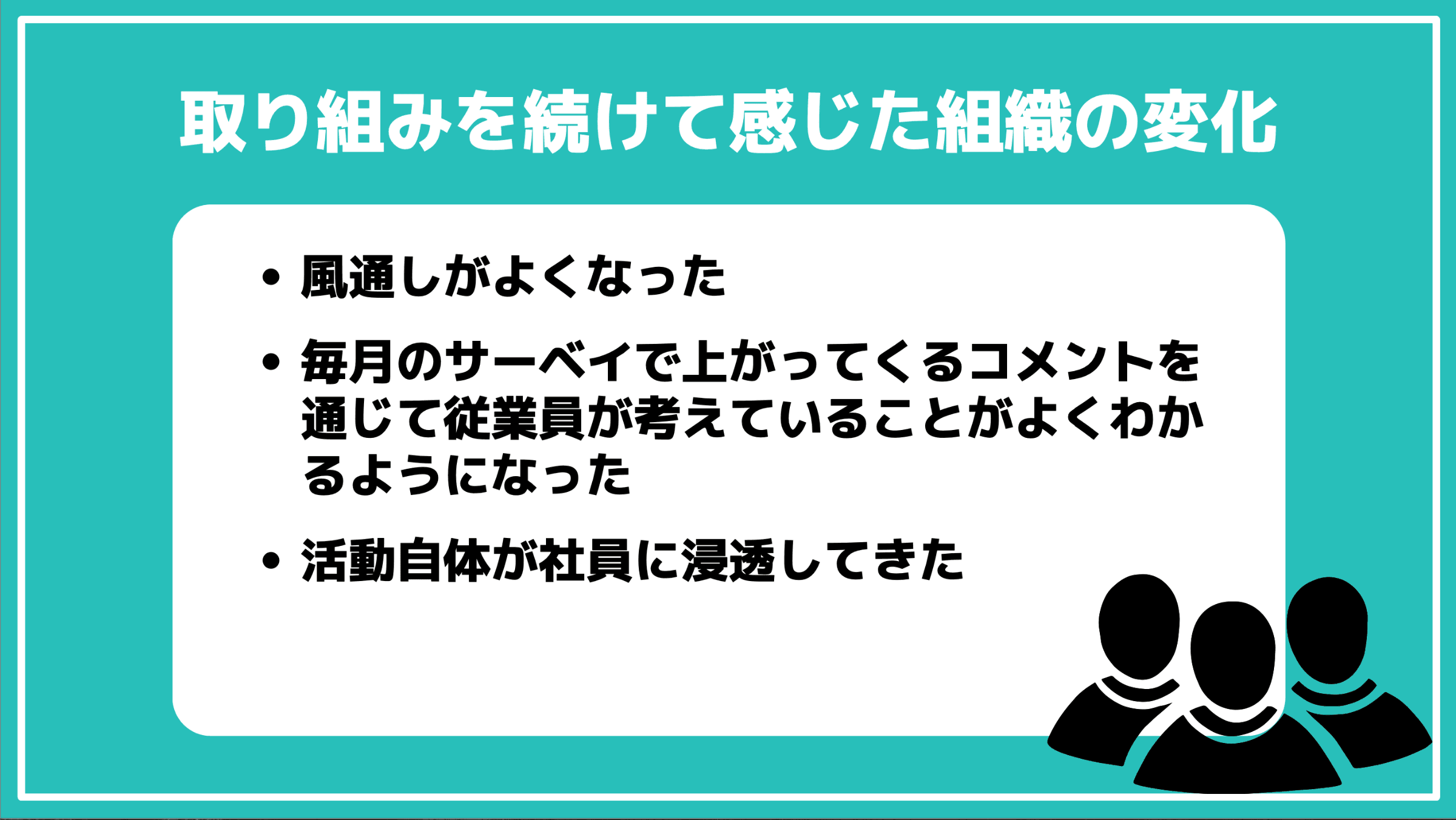 また、経営幹部から見ると、毎月のサーベイで上がってくるコメントを通じて従業員が考えていることがよくわかるようになりました。当初は本当にいろんなコメントがありましたが、回答を真剣に考えて返すうちに、だんだんと活動に対して辛辣な意見が減ってきました。例えば、「給料を上げてほしい」という意見に対しては別途、従業員満足度向上活動を会社として行うなど、各コメントに対してできる取り組みを進めています。コメントを受けることが、改善に繋がっていると感じますね。
