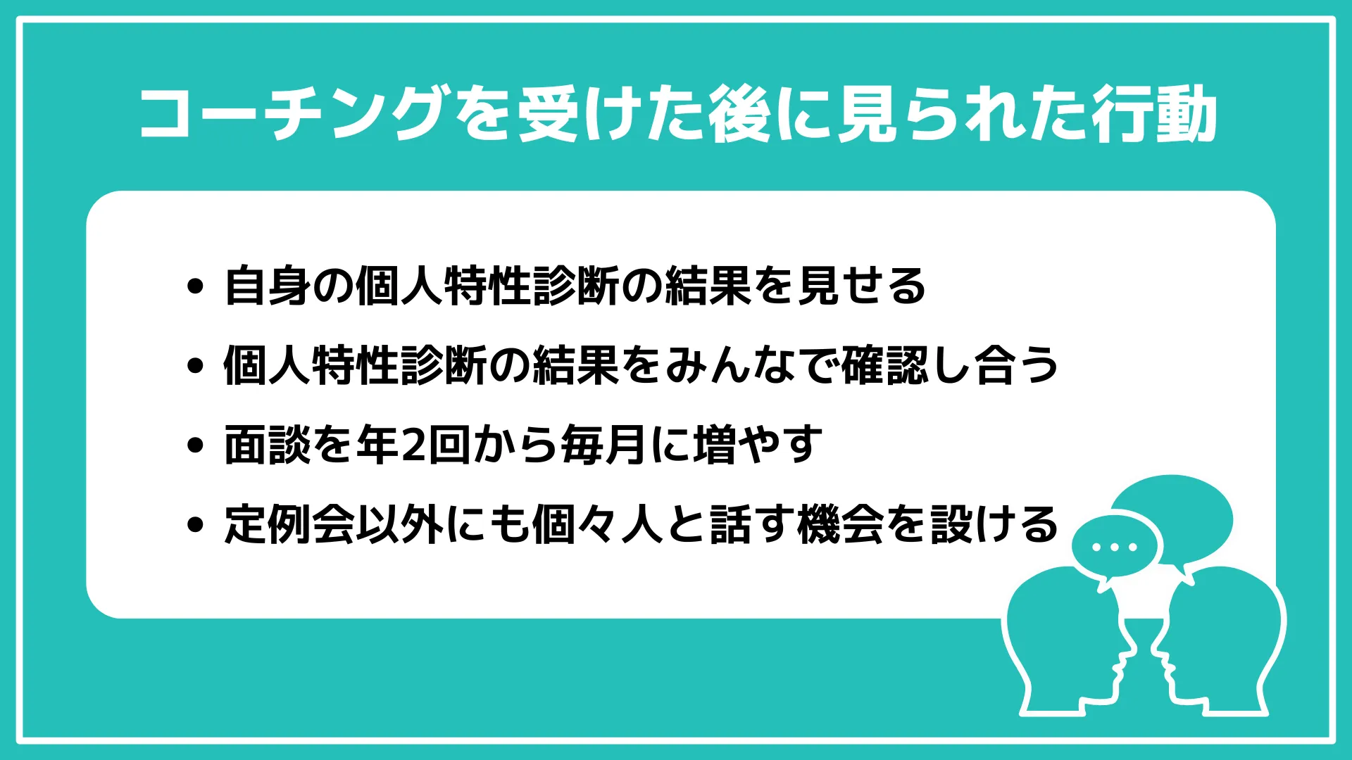―他にも、コーチングを経て管理職の皆さんに見られる変化や行動はありますか?