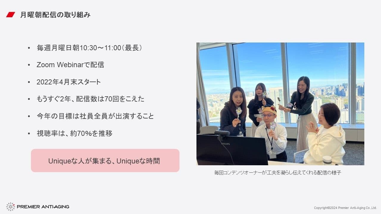 宮森:毎週月曜日の朝10時半から、30分ほど社内向けにオンラインでの配信を行っています。「朝配信」と呼んでいて、2022年に始まってもうすぐ2年が経つのですが、社内の7割以上の方が配信を視聴してくれています。内容は、各部門の取り組みや、制度についての紹介、新ブランドや商品リリースの裏側を担当者が話すこともあれば、ブランド周年やアワード受賞などのお祝いの共有など、本当に様々です。「Uniqueな価値を生み出す」ことを大事にしている私たちらしく、社内のあらゆる出来事を取り扱いながら、Uniqueな社員が集い、それぞれの形で情報を発信する、唯一無二の時間になるよう心がけています。