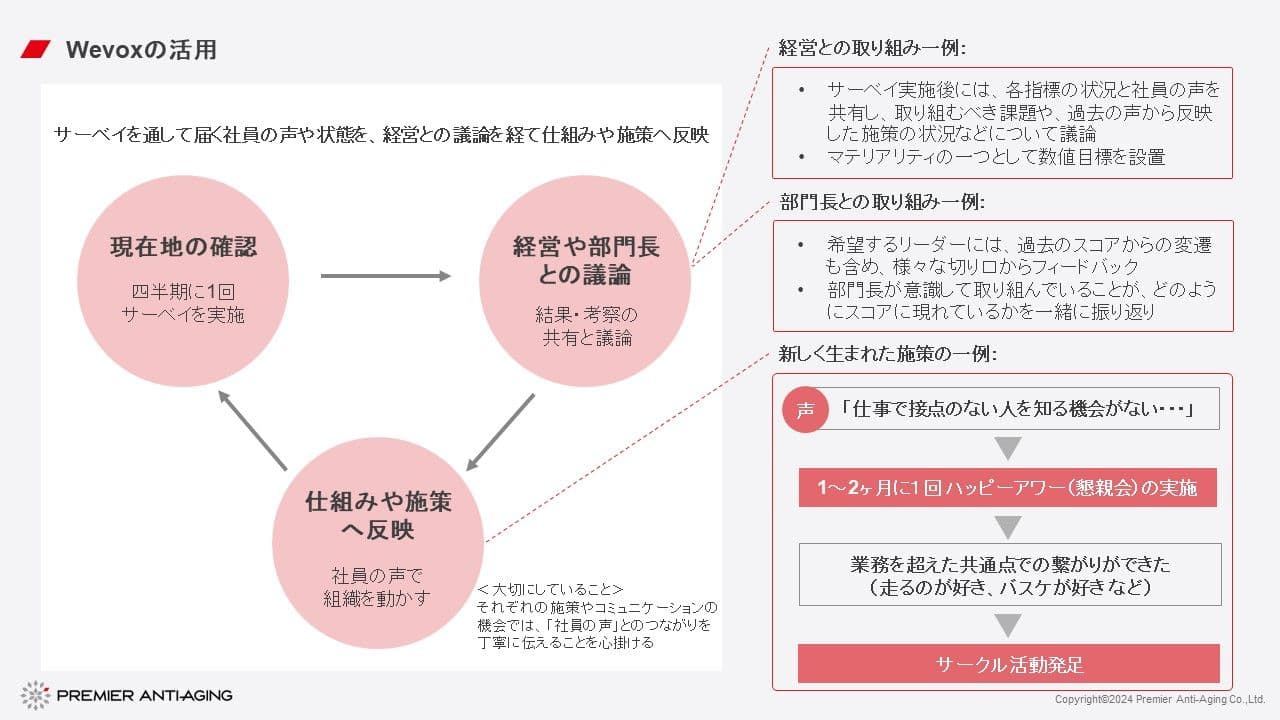 Wevoxを導入し、継続的に社内のエンゲージメント向上に取り組んでいるプレミアアンチエイジング株式会社。それぞれのキャリアや経験を活かしながら、企業理念の実現に向けエンゲージメント推進活動に取り組むお二人に、活動の歩みや心得を伺いました。