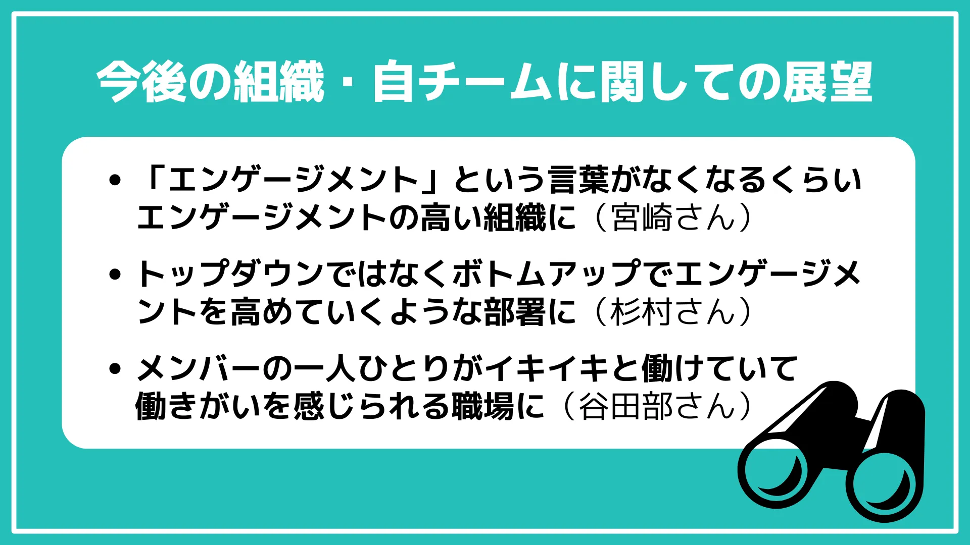 「チーム開発では、人をマネジメントすることや、エンゲージメントを上げていくことがパフォーマンスに直結する」ということを、みんなで共通認識として持って、トップダウンではなくボトムアップでエンゲージメントを高めていくような部署になればいいなと思います。
