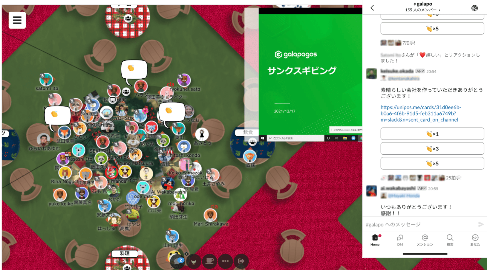 (「oVice」にて開催した2021年オンライン忘年会の様子。「Unipos」も活用されています)