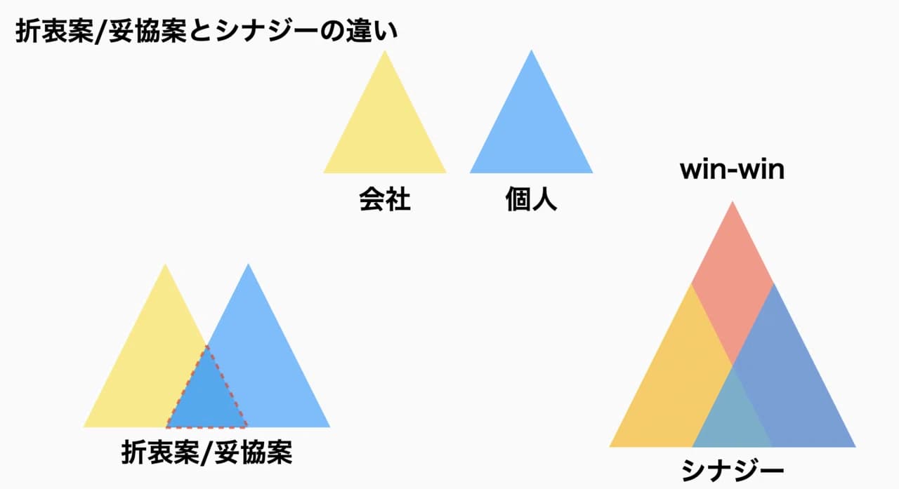 下記はwin-winを説明するときに良く使われる図だと思うのですが、会社が目指すものと個人の幸せがあったとき、その重なりがいわゆる「折衷案/妥協案」(下記の図の左)だと思います。
