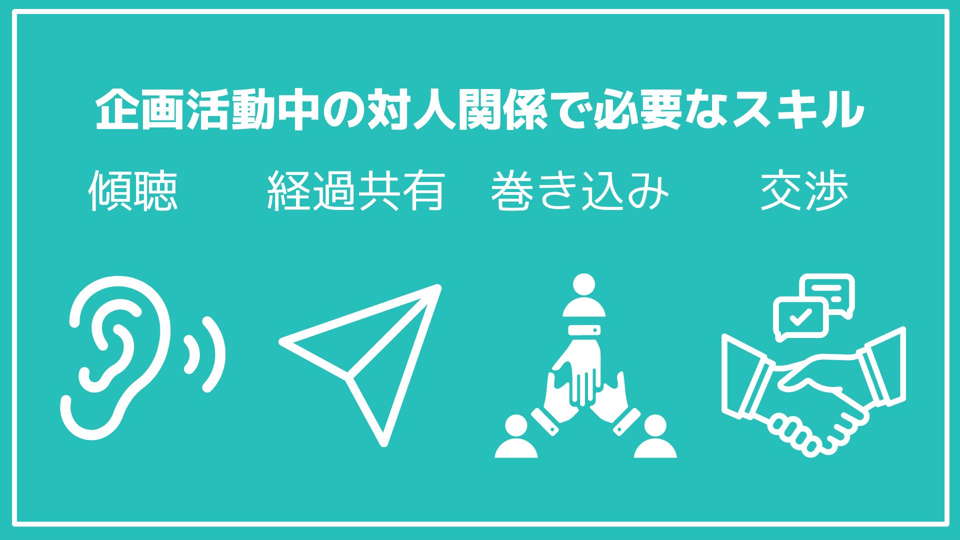 改革の企画活動の中で必要な対人関係スキルとして「傾聴力」、「活動経過の共有力」、「巻き込み力」、「交渉力」があります。