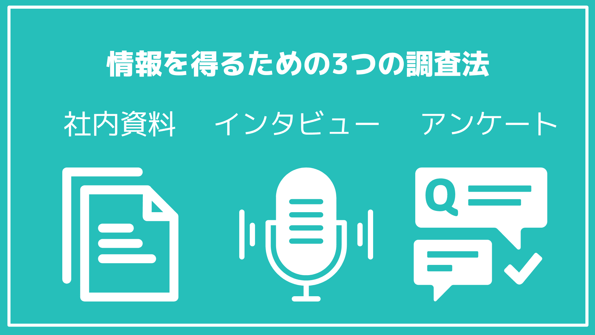企画活動を進める過程では、各種調査スキルを用いて現状把握や改革構想づくりにつながる情報を入手します。ここでは、3つの調査(資料、インタビュー、アンケート)について考えてみたいと思います。