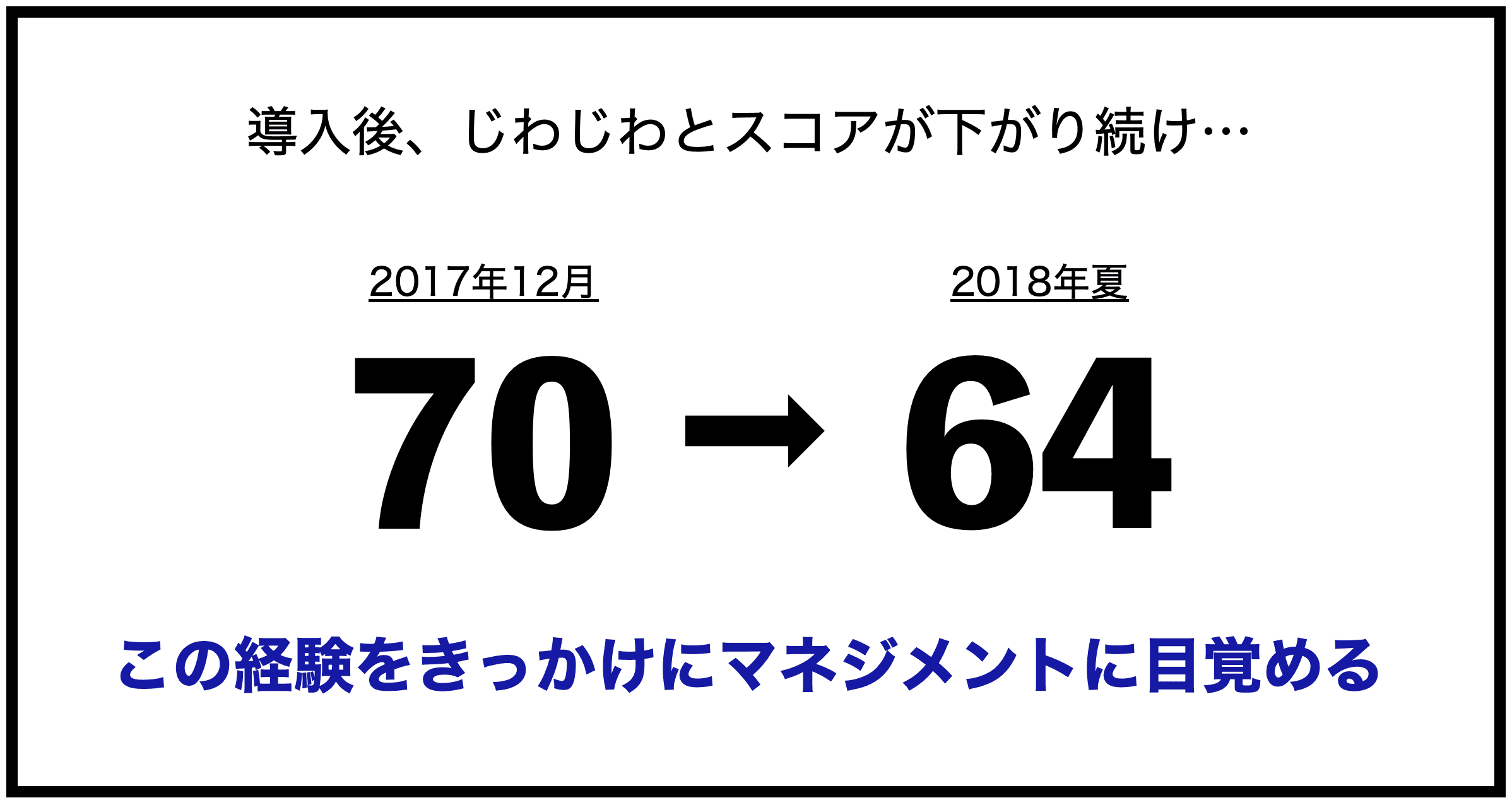 大きなきっかけは、wevoxのスコアが落ちてきたことです。wevoxは、私がマネージャーになった後の2017年の12月から弊社に導入されていたのですが、毎月じわじわとスコアが落ちていました。最終的に、もともと70程度だった総合評価が半年ほど経った2018年の夏には64にまで落ちてしまい、至るところでメンバーとうまく噛み合っていない感覚が増していったのです。
