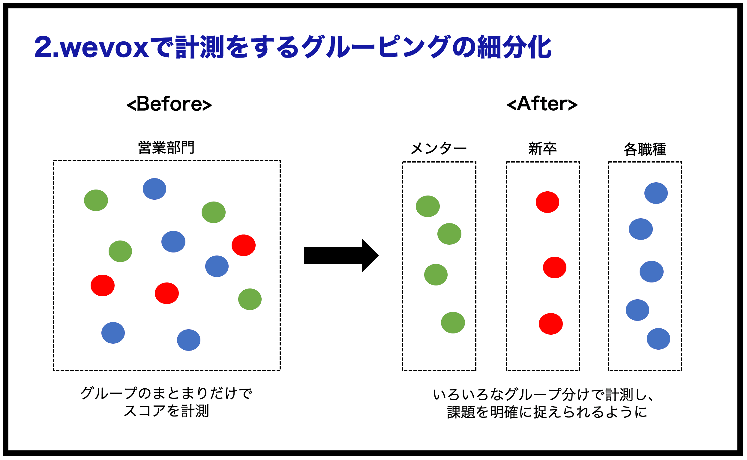 wevoxの計測結果を表示するグルーピングをより細かく設定し、いろいろなグルーピングで現状把握ができるようにしました。これまでは20人のグループで1つの計測結果だったのが、職種単位、入社年次、メンター(新入社員に1人ずつにつくメンターのこと)などいろいろなグループで分けて現状把握をするようにしたのです。