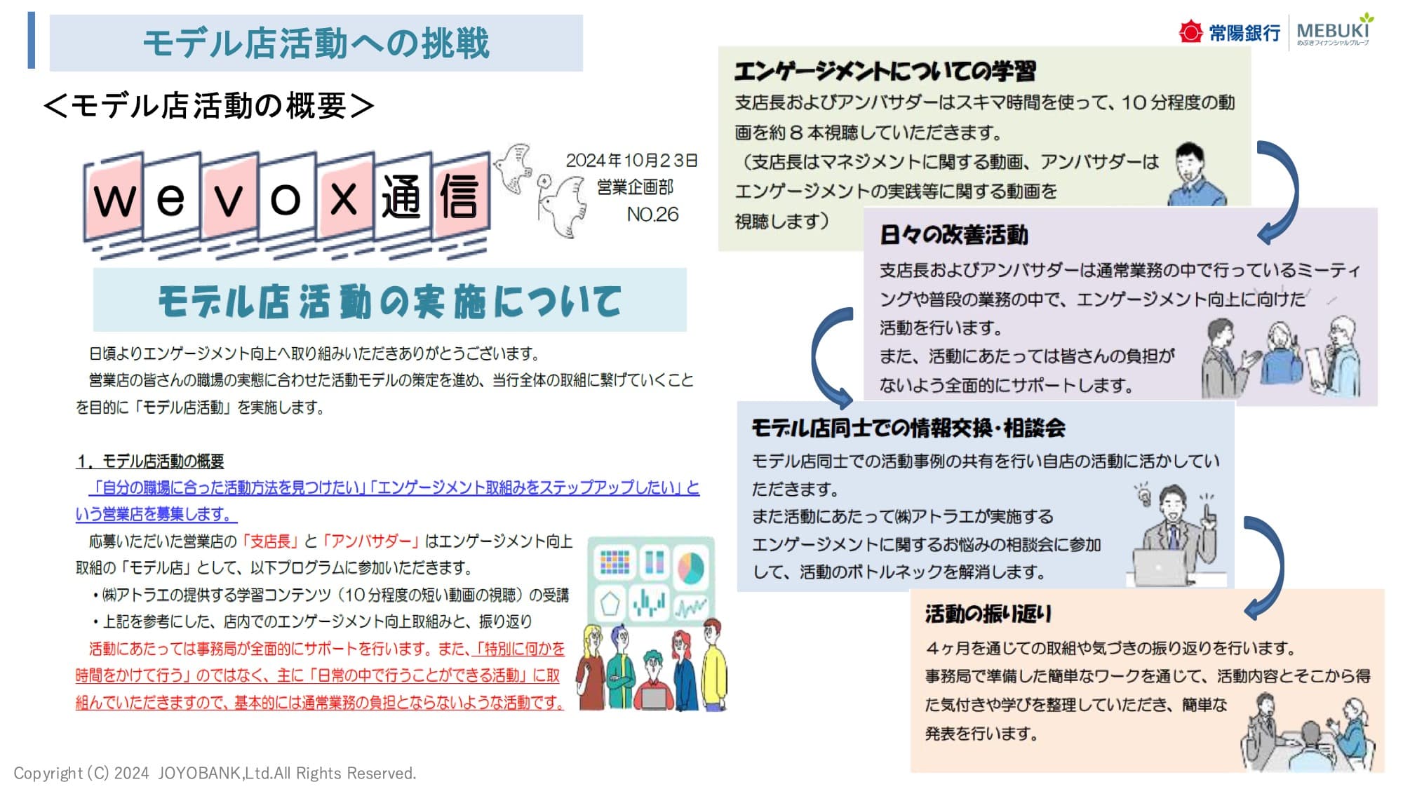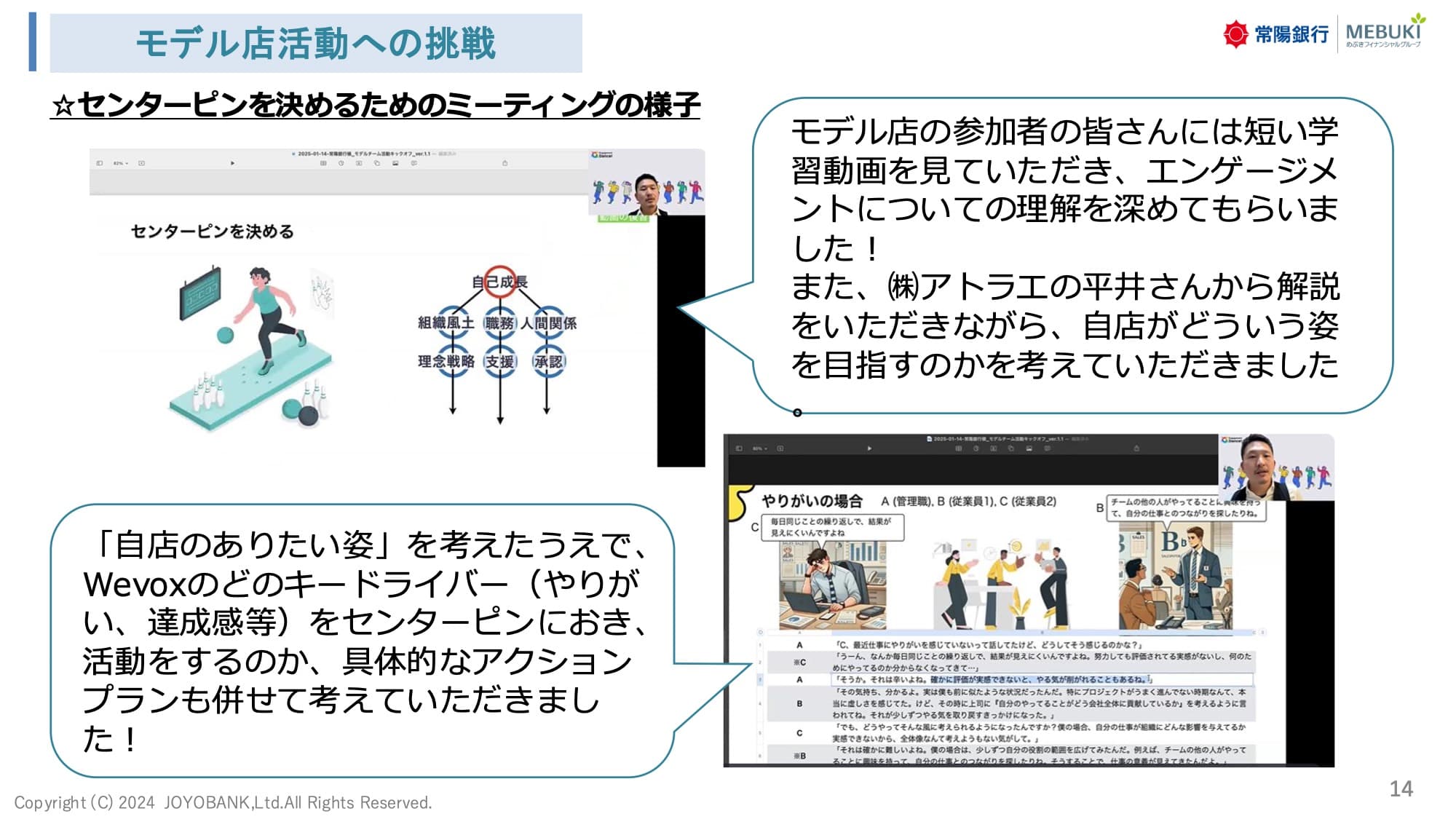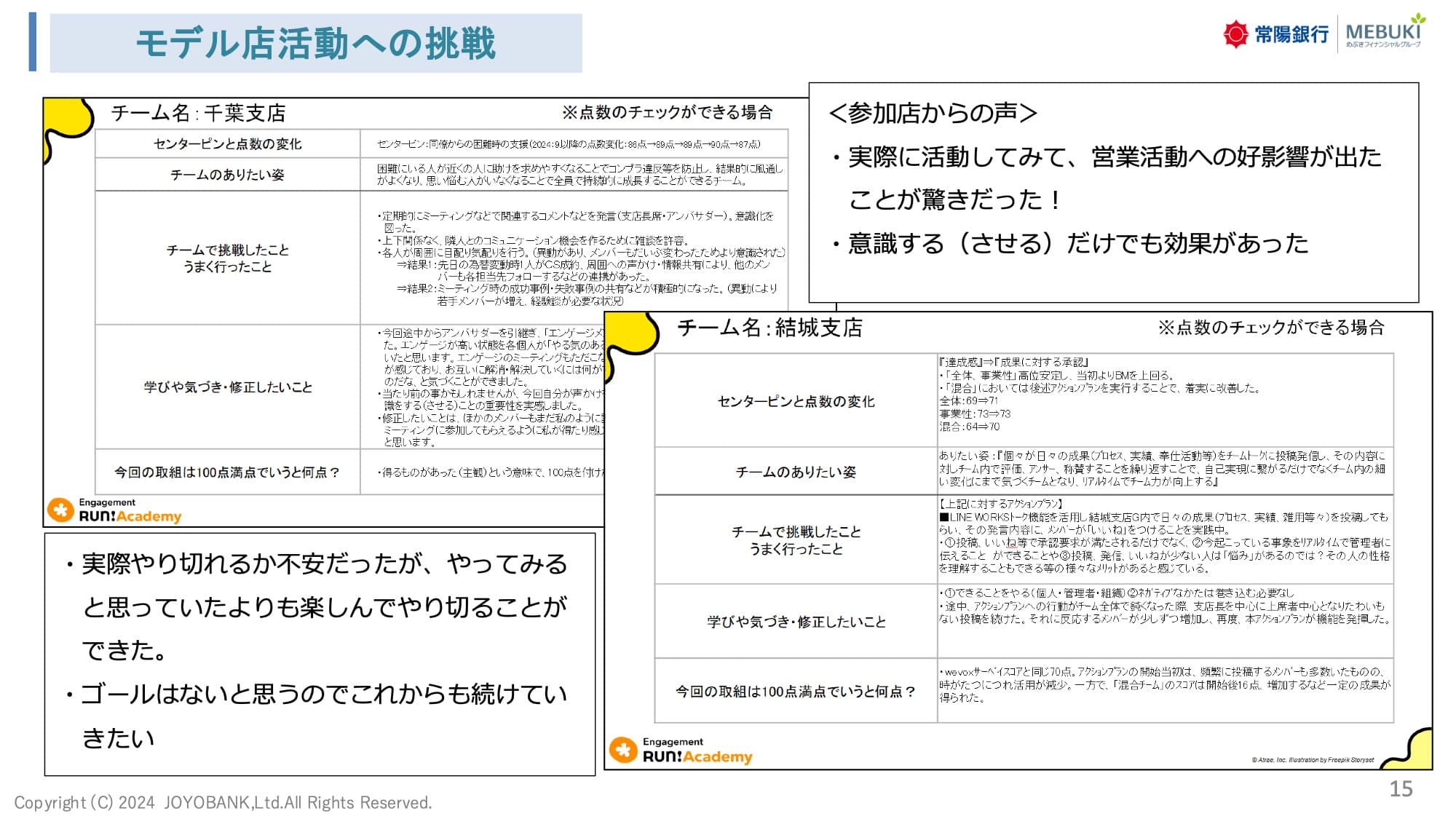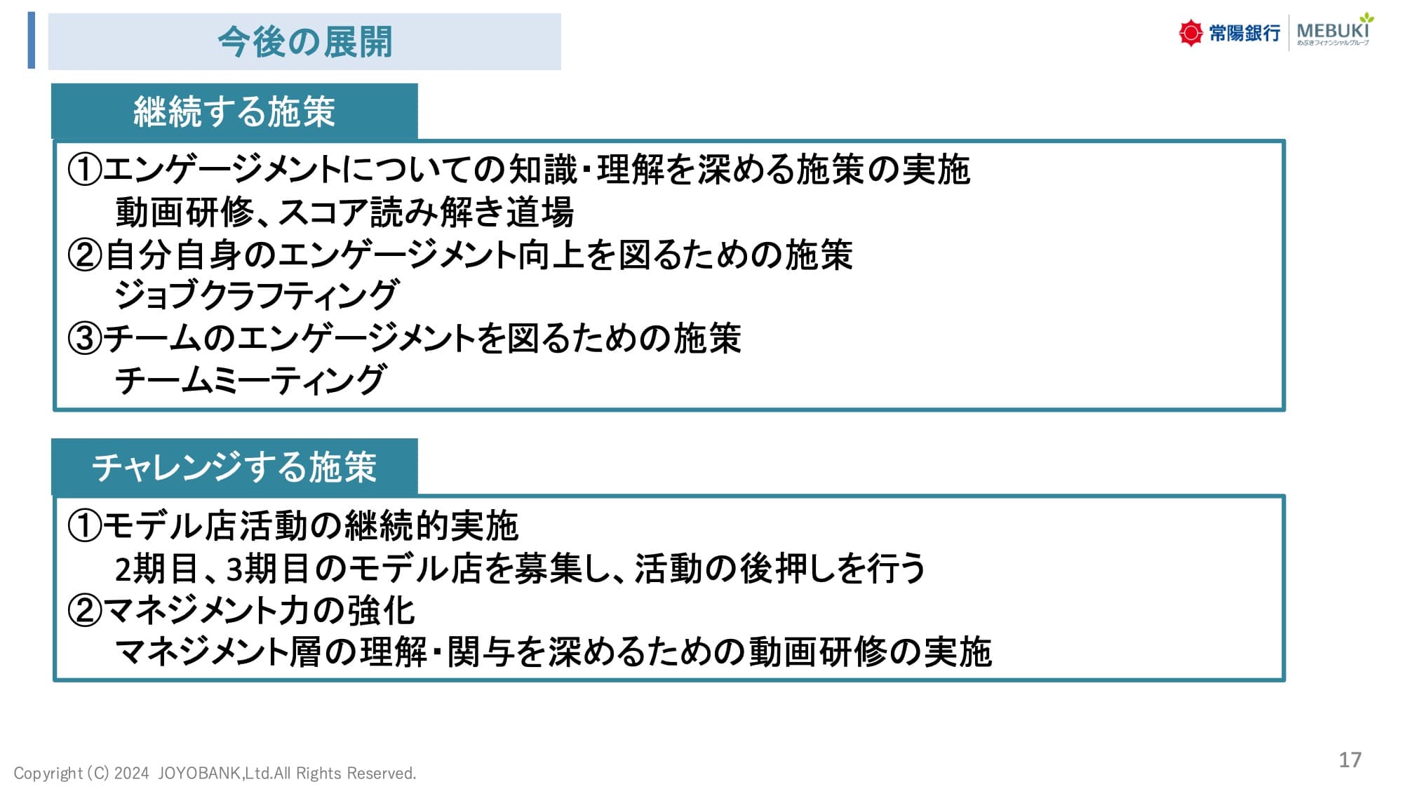 このモデル店活動でもマネジメント層である支店長の関与が非常に重要ということがわかりましたので、マネジメント層の理解や関与を深めるための研修も追加で実施したいと考えています。