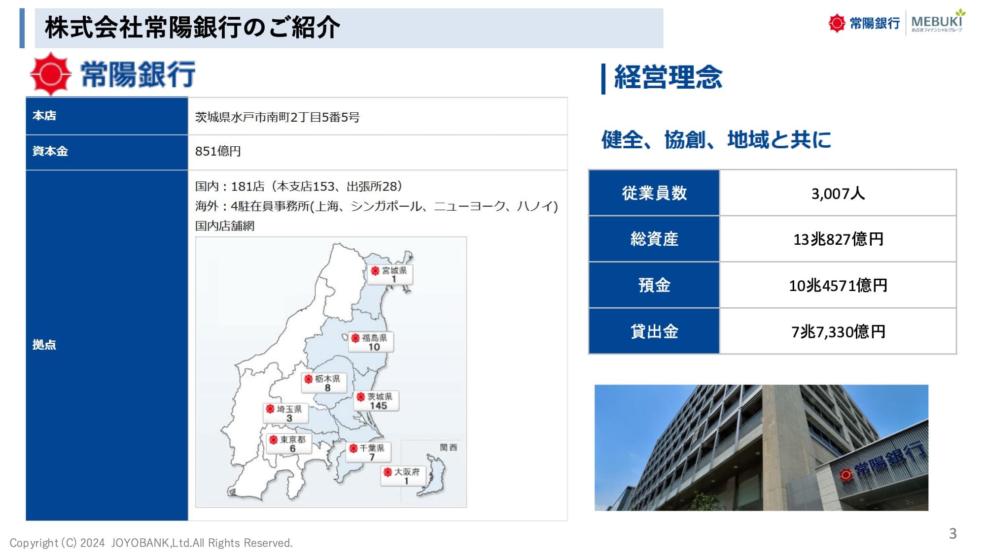 まず初めに、当行について簡単にご紹介します。常陽銀行は、茨城県の水戸市に本店を構えております。営業エリアは茨城、福島、栃木、千葉、埼玉、宮城、東京、大阪の一都一府六県で、181の支店・出張所を展開しております。