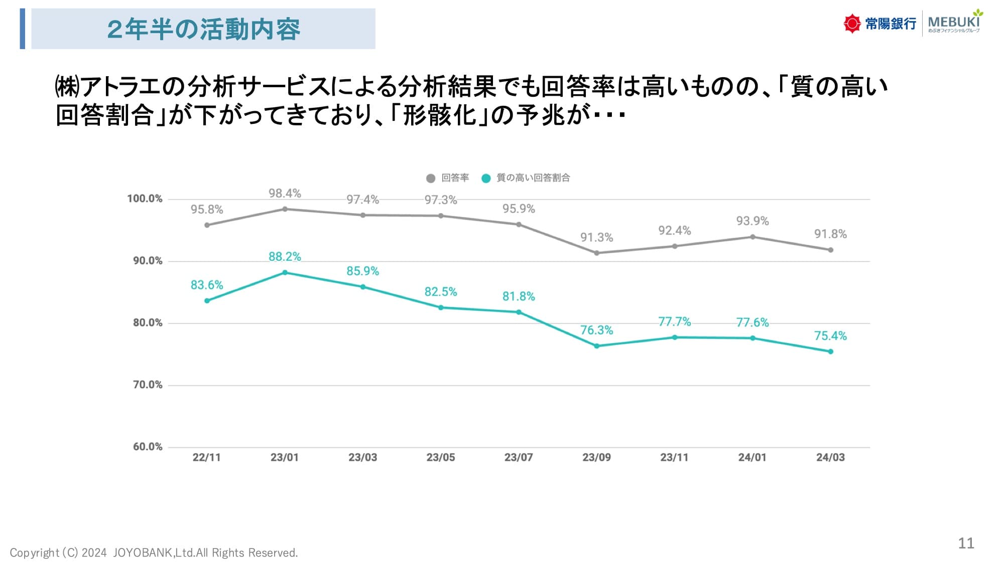 複合的に分析していただいた結果、「回答率は高いけれども、質の高い回答割合が下がってきており、形骸化の予兆がありますよ」というご指摘をいただきました。私たちがなんとなくうまく回っていないと感じていた原因が「マンネリ化」「形骸化」によるものだということがデータからも分かりました。