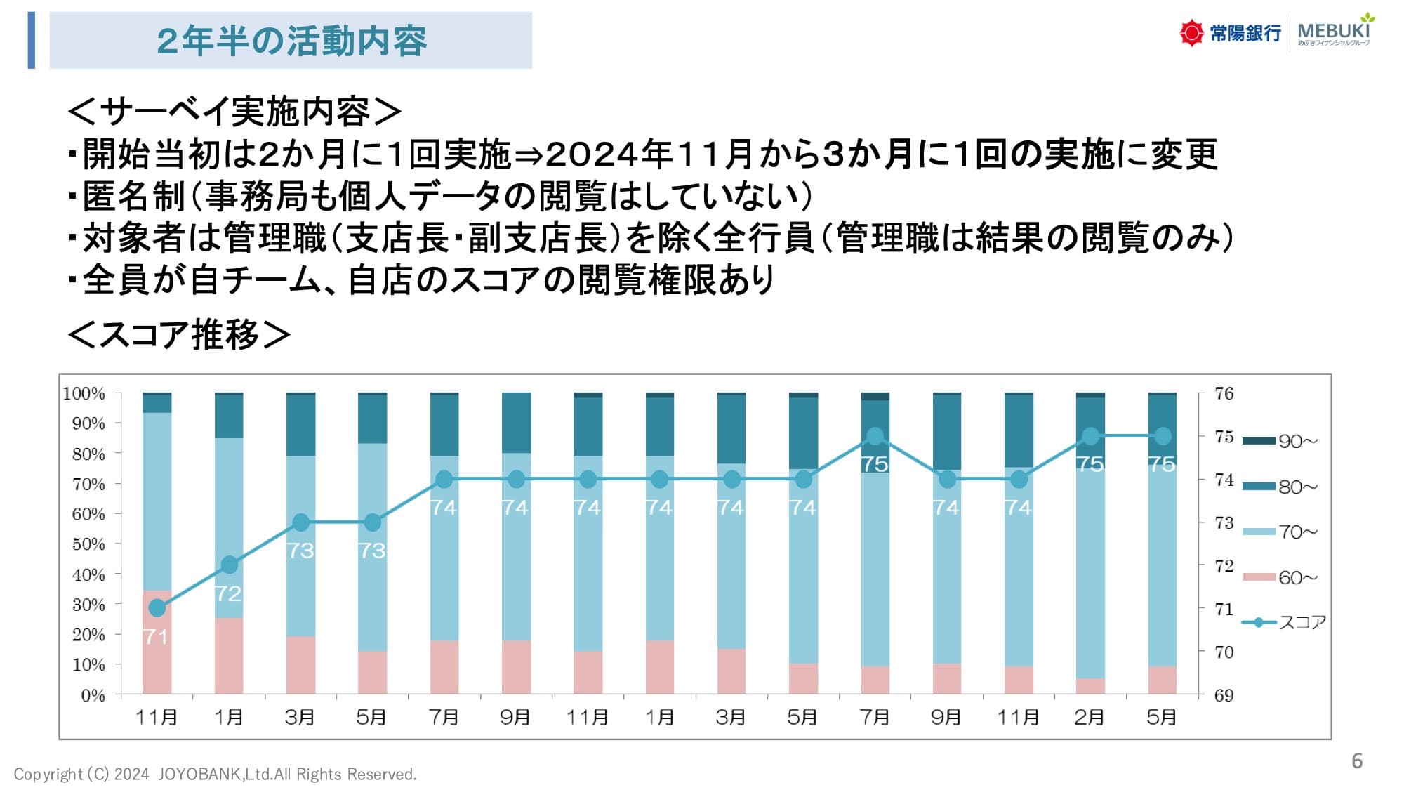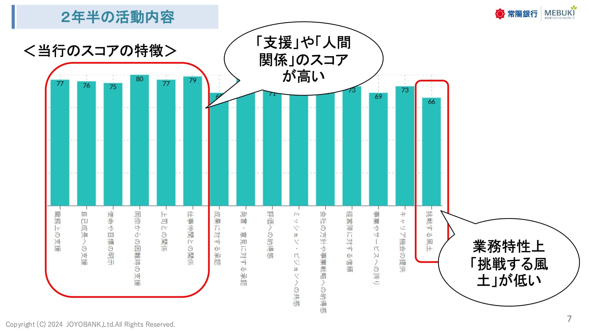 スコア自体は、開始当初は71でしたが、直近のスコアでは75で、だいぶ改善が図られてきている状態だと感じています。当行の特徴として、支援や人間関係のスコアが比較的高い傾向にあります。