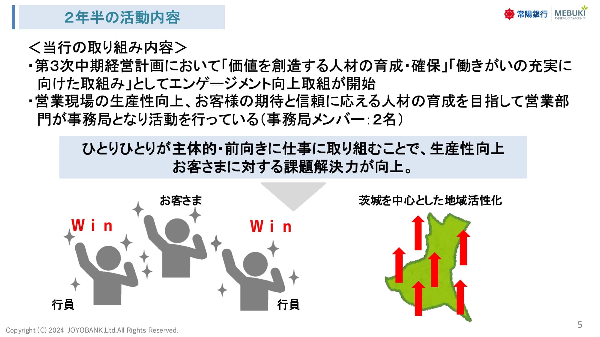 エンゲージメントが向上すれば、一人ひとりが主体的に仕事に取り組むことで生産性が向上し、お客様に対する課題解決力も向上すると考えています。最終的には地域経済の活性化につながるという考え方のもと、営業部門が事務局となって活動しています。