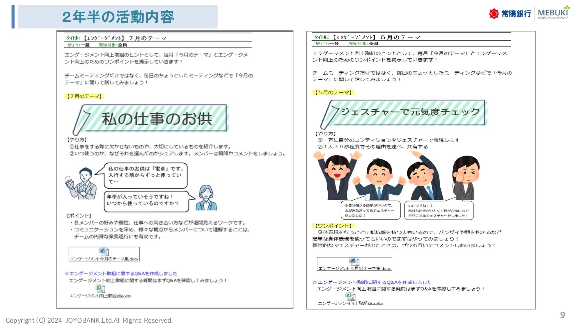 またアンバサダー制度を導入し、各営業店にエンゲージメントのアンバサダーを置き、事務局と現場の橋渡しの役目を担ってもらっています。当行には181の営業拠点があり、事務局が全ての拠点に出向いて活動を浸透させていくことは難しいという背景からです。
