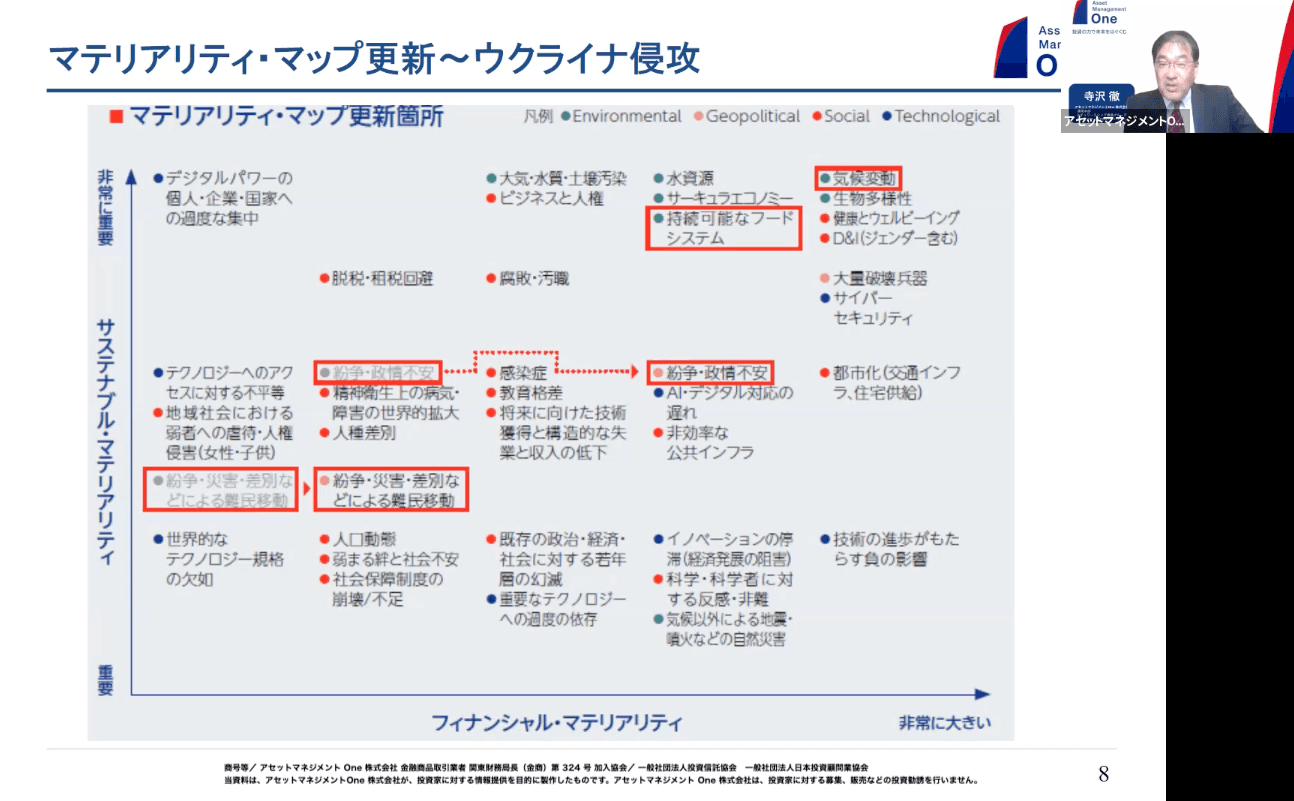 寺沢:経営戦略との一体化というようなお話をさせていただきましたが、全体の長期のサステナビリティに関する取り組みや、企業が長期的な目線での経営をどう作っていくかも、大きなポイントになるかなと思います。