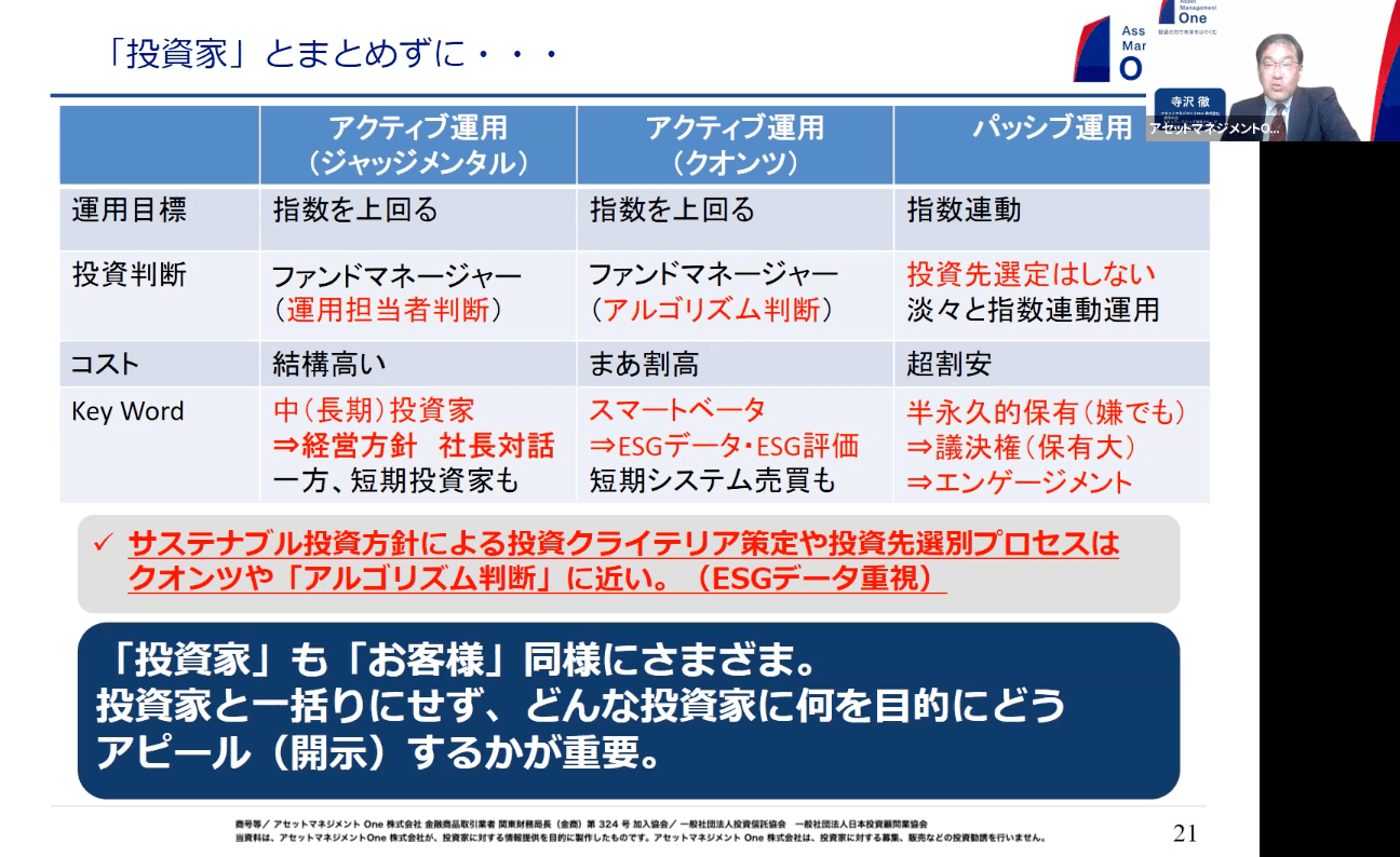 ジャッジメンタルはコストも高いですが、企業との対話や経営方針を見ることもあれば、短期でマーケットの材料を拾いながら売り買いを行うこともあります。クオンツは、1回ルール決めるとあとは淡々と運営していくので、そんなにコストは高くなく、システム売買のような形で運営していくこともあります。パッシブ運用のポイントは半永久的に保有することです。こんな会社に投資したくないと思っても、トピックスや日経平均に入っていると投資せざるを得ません。つまり、嫌でも付き合わなきゃいけないうえに、半永久的につきまとうわけです。今回のテーマは企業への情報開示ですが、皆さんから見たお客様と同じで、投資家も様々です。ですから、一括りにしないで、皆さんがどういう投資家に対して情報開示をする、またはアピールするか考える、いわゆるマーケティング的な発想が重要です。