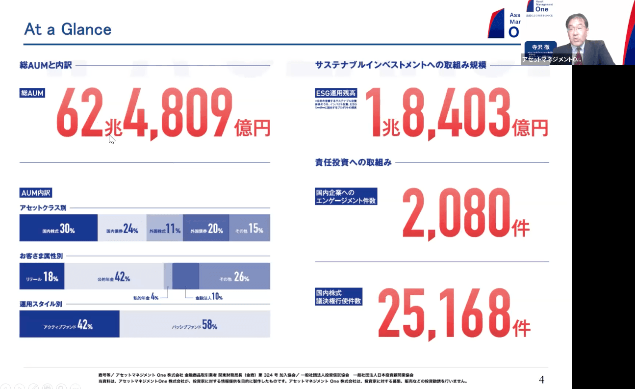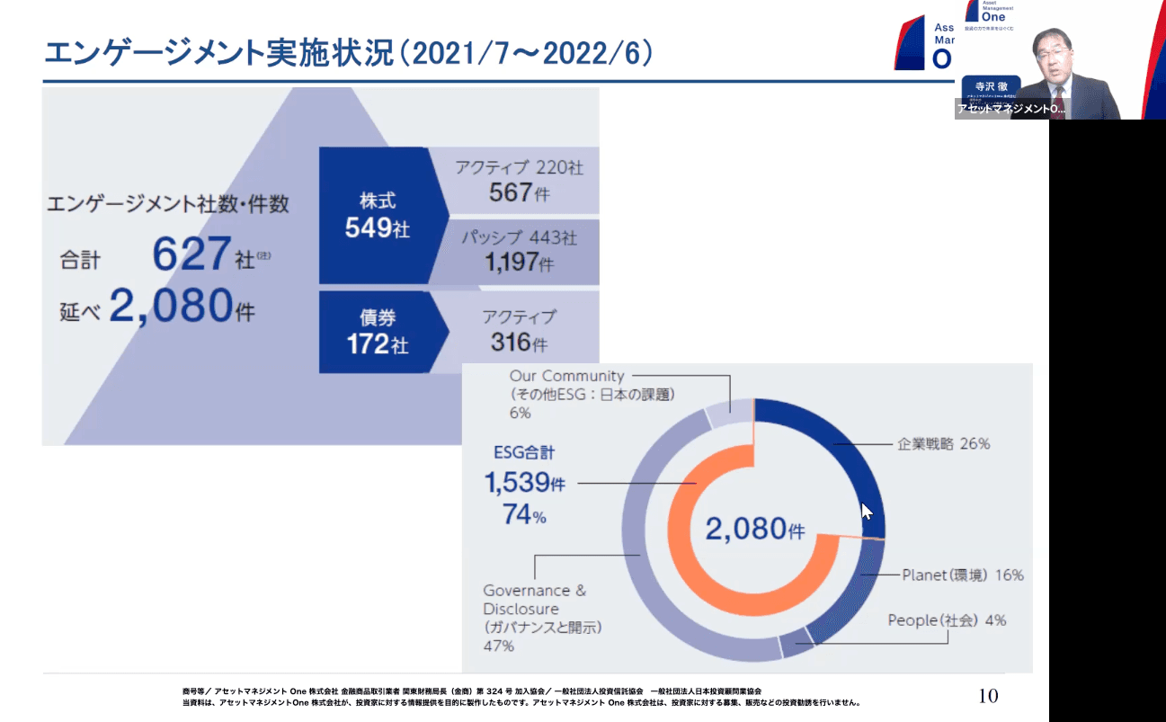 パッシブ運用の観点からのエンゲージメント、そして企業との対話という意味のエンゲージメントも含めて、2021年度は600社ちょっとに対して約2000件の対話を行っており、1社と年3回ほどしっかりとお話しさせていただいている状況です。私の部署で手がけているパッシブ分野の場合、特に議決権に関するミーティングが多いので、エンゲージメントを行う件数・会社というのが大きくなっており、対話の中のお題もESGに関するものが約4分の3を占めています。アセットマネジメントOneができた当初の2016年頃ではこの割合は半分ぐらいだったので、徐々にESGに関する話題が増えていると感じています。