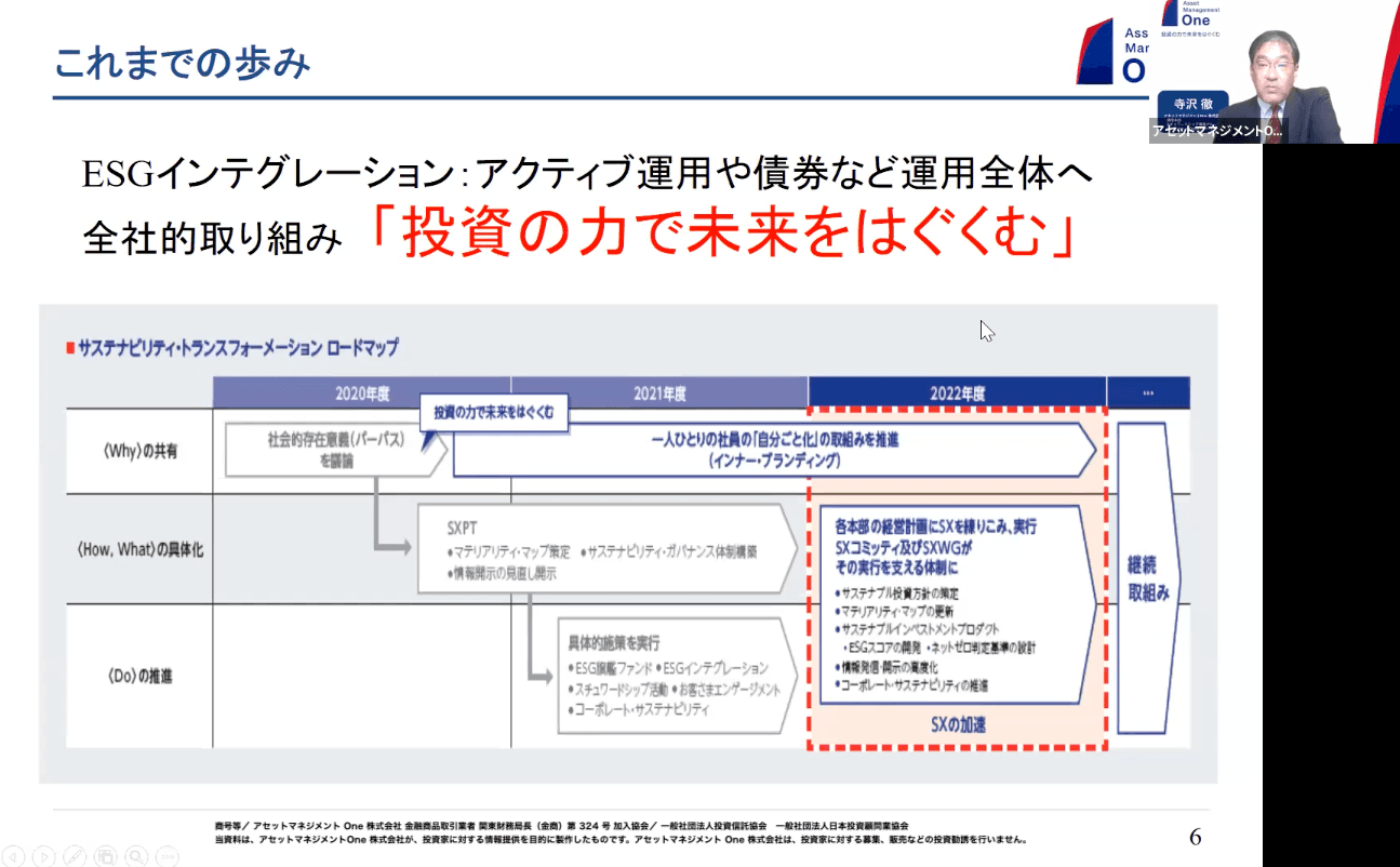 アセットマネジメントOneができた2016年から、今の責任投資という部門でチームを任されており、議決権行使や企業との対話、スチュワードシップ活動を率いています。また、業界活動などもしていましたので、経産省などの各種委員などにもお声がかかり、そちらでの活動も行っています。ESGの分野と言うのは通常、株式のアナリストをずっとやっていた方が多いですが、私自身は皆さんと同じように企業の本部に近いところで新しいビジネスを立ち上げた経験や、財務に近いような分野の経験があるため、こういった部分が企業との対話などにも上手く生かされていると思っています。次に、アセットマネジメントOneのサスティナビリティへの取り組みを簡単に説明させていただきます。