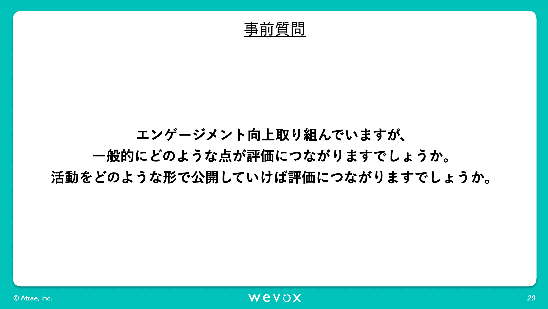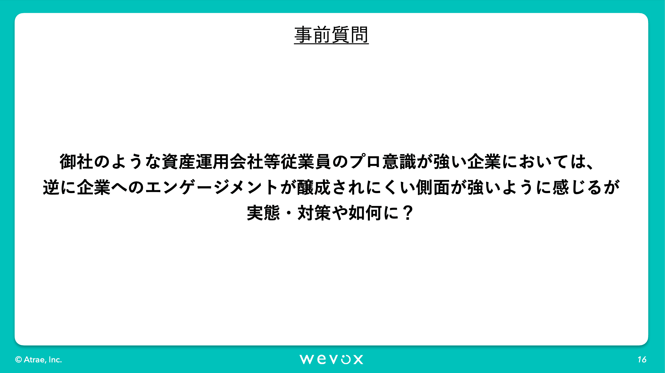 寺沢:冒頭に川本さんがお見せしていた資料のエーザイさんと三井住友さんのページのような形で開示されていくものなのかなと思っています。Wevoxの質問項目って、各社ごとに考えたりすることもあるわけですよね?