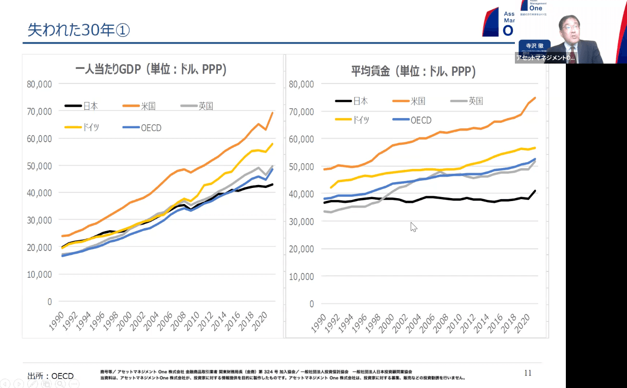 こちらは皆さんも見慣れたグラフだと思います。日本の1人当たりのGDPは欧米に比べて伸び感がいまいち。平均賃金も、他の国は伸びている一方で日本は30年間ほとんど横ばいです。人材投資においても、元々諸外国に比べて低かったのがさらに縮んでいます。日本の場合、人材投資を人件費として捉えていました。その後、90年代後半から2000年にかけてバブル崩壊後の不況が訪れ、円安になることもなく、ハンディキャップをつけられたまま円高の状態で不良債権処理などを続けることとなりました。