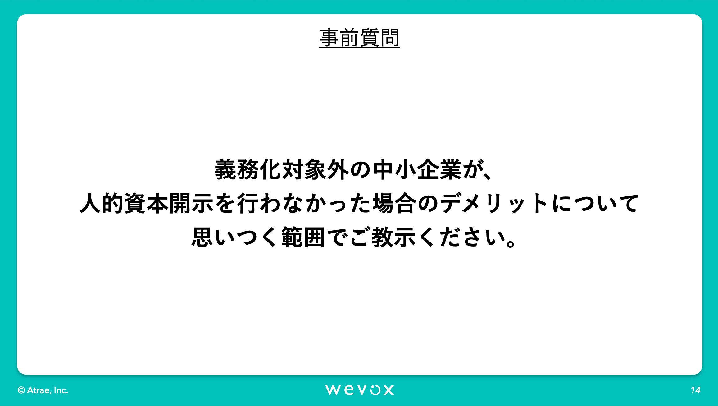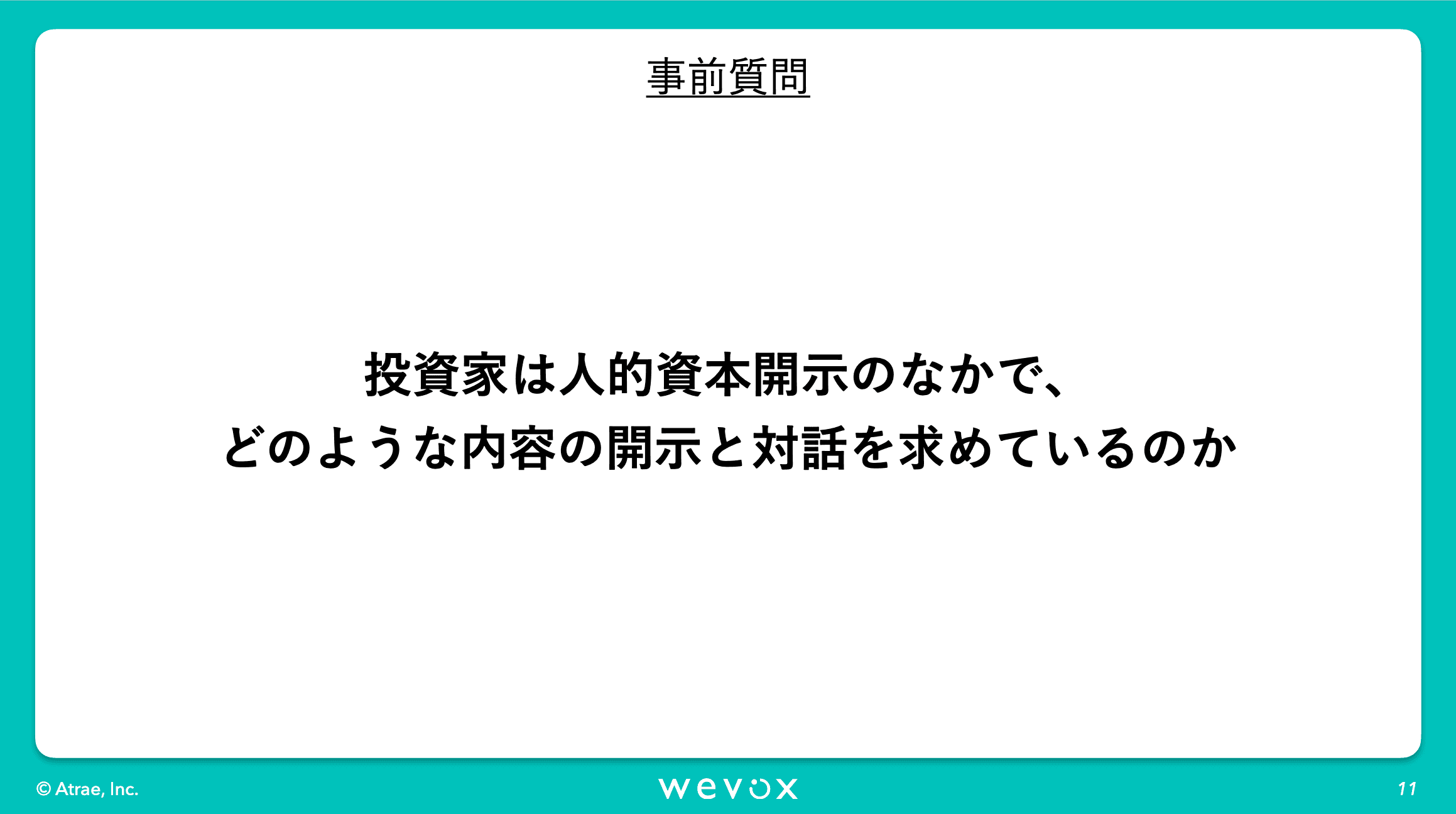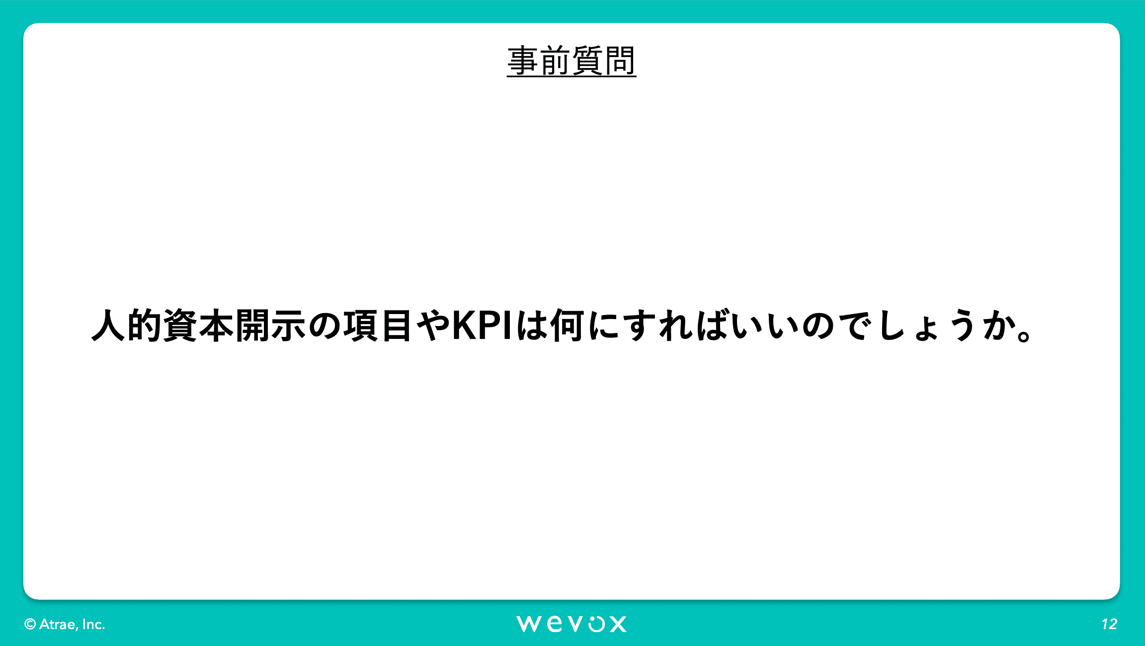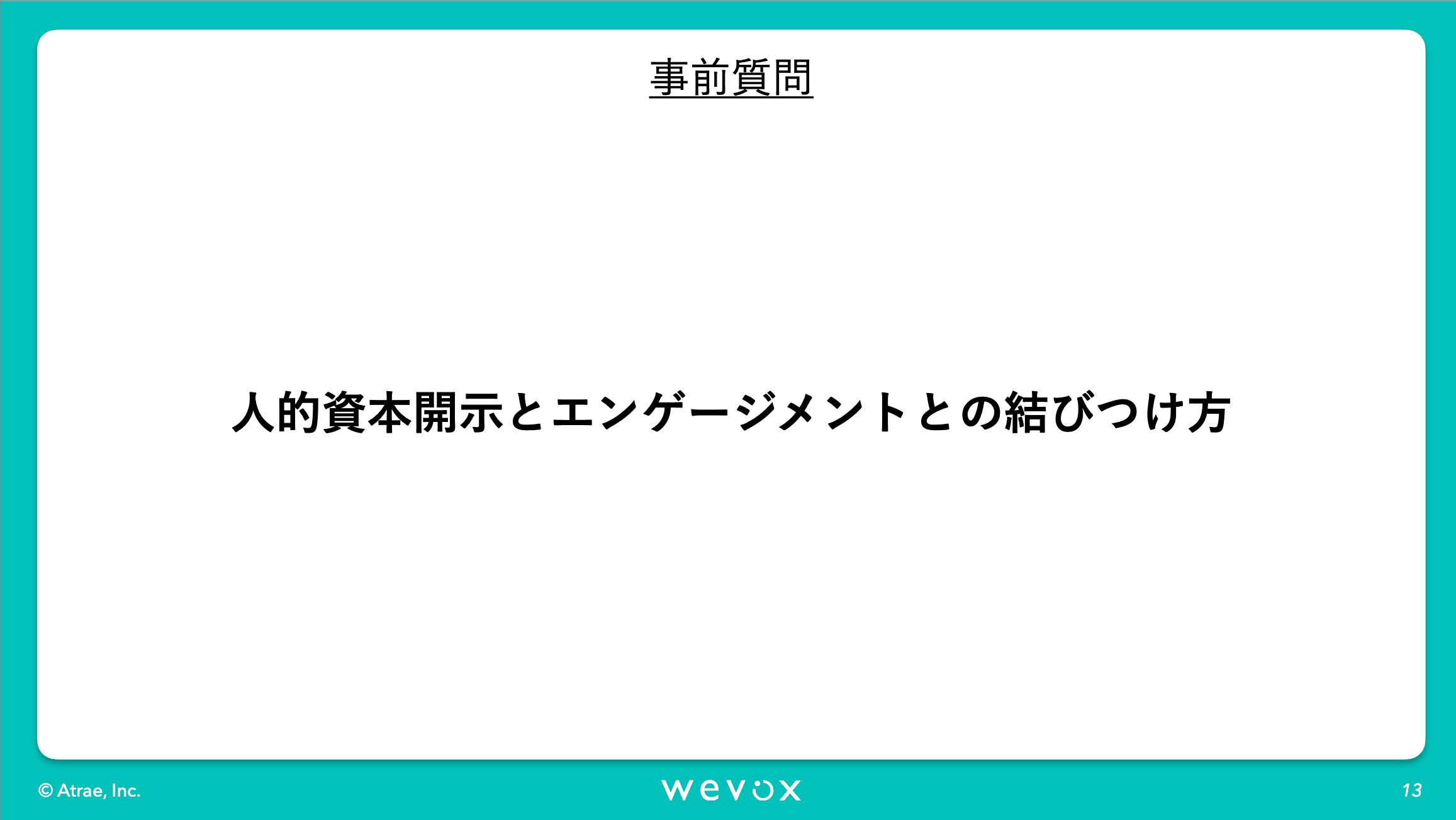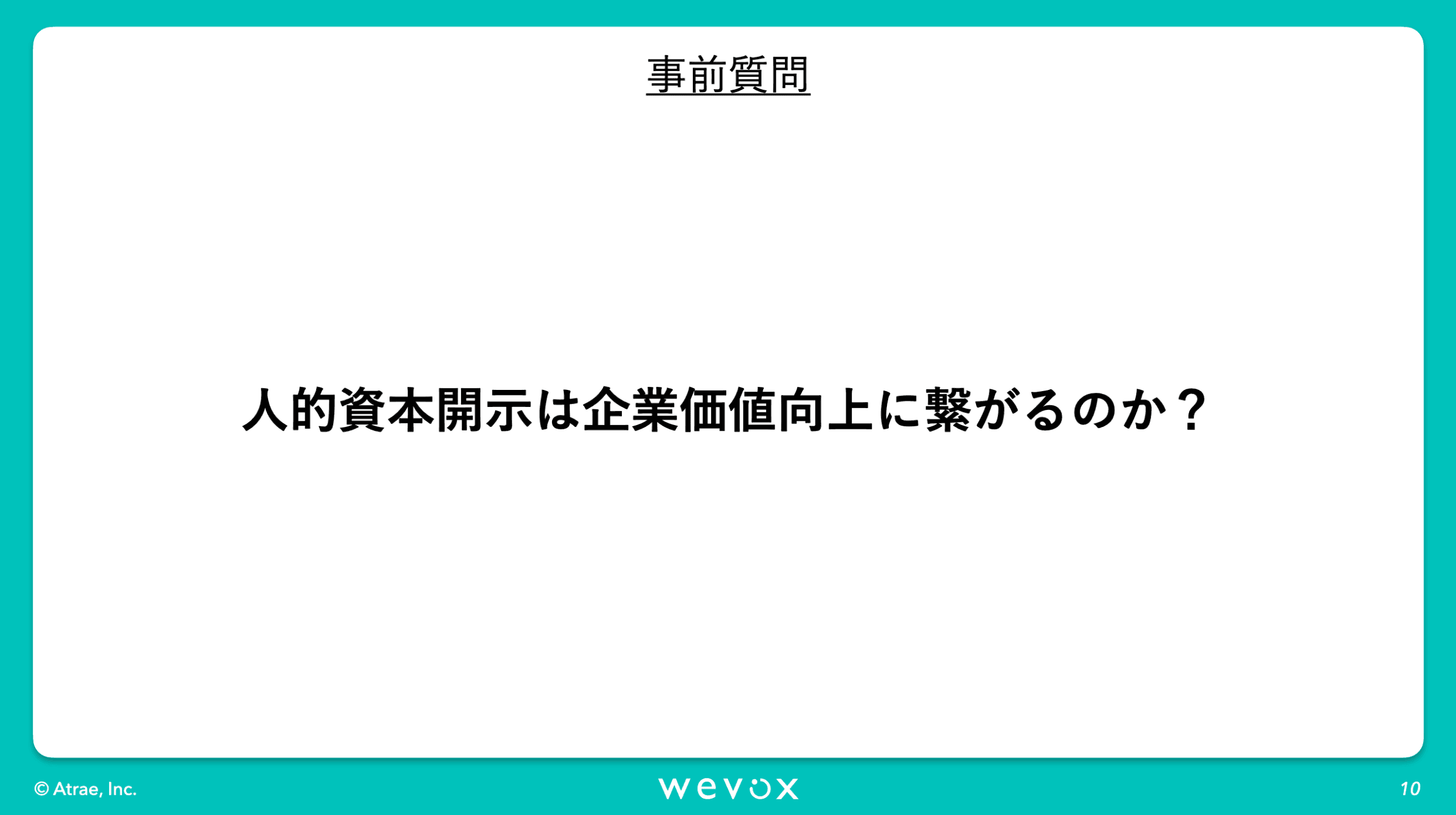昨今非常に注目されております人的資本開示の文脈において、統合報告書等でWevoxのエンゲージメントスコアを開示いただくような企業様も増えてきています。Wevoxにご興味いただく企業様からも「人的資本開示とは何なのか」といったご相談を非常によく受けます。プロの視点から人的資本開示においてのお話をいただければなということで今回、このような会を設けさせていただきました。それでは寺沢さん、よろしくお願いいたします。