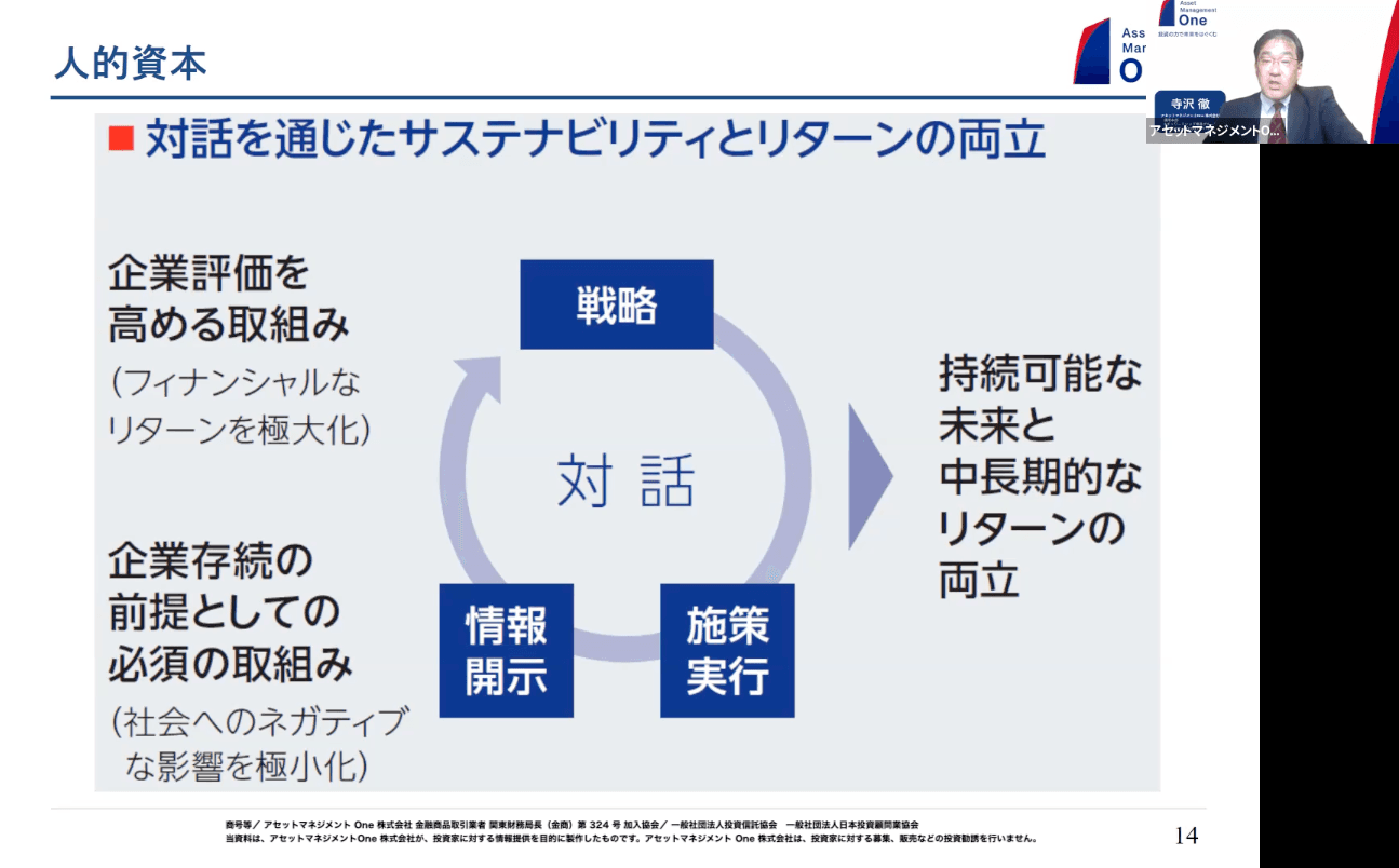 これは伊藤先生が中心に立ち上げたコンソーシアムでも我々の方からお示しした図ですが、当社としては、人的資本には大きく分けて2つの必要な取り組みがあると思っています。最低限やっていただきたいのは、社会へのネガティブな影響を減らすことを目的とした、男女間の賃金の比率や研修など、企業存続の前提として必須の取り組み。そして、もう1つが企業価値をどう高めていくかについての取り組みです。そのためには、まず取り組みを考えていただいて、それをどう情報開示して具体的な戦略に落とし込んでいくかが重要となります。当社でも、企業との対話などを含めてこのような取り組みをお願いしています。