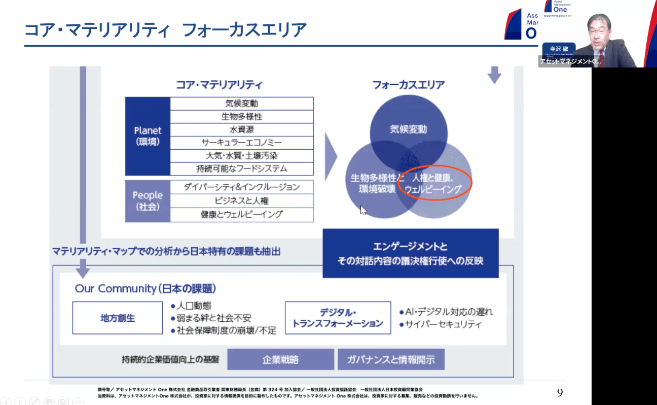 当社では、先ほどの図の右上にあった気候変動や生物多様性に加えて、人権と健康・ウェルビーイングの3つを大きく取り上げ、フォーカスエリアとして捉えています。これは企業との対話や投資に役立てられています。