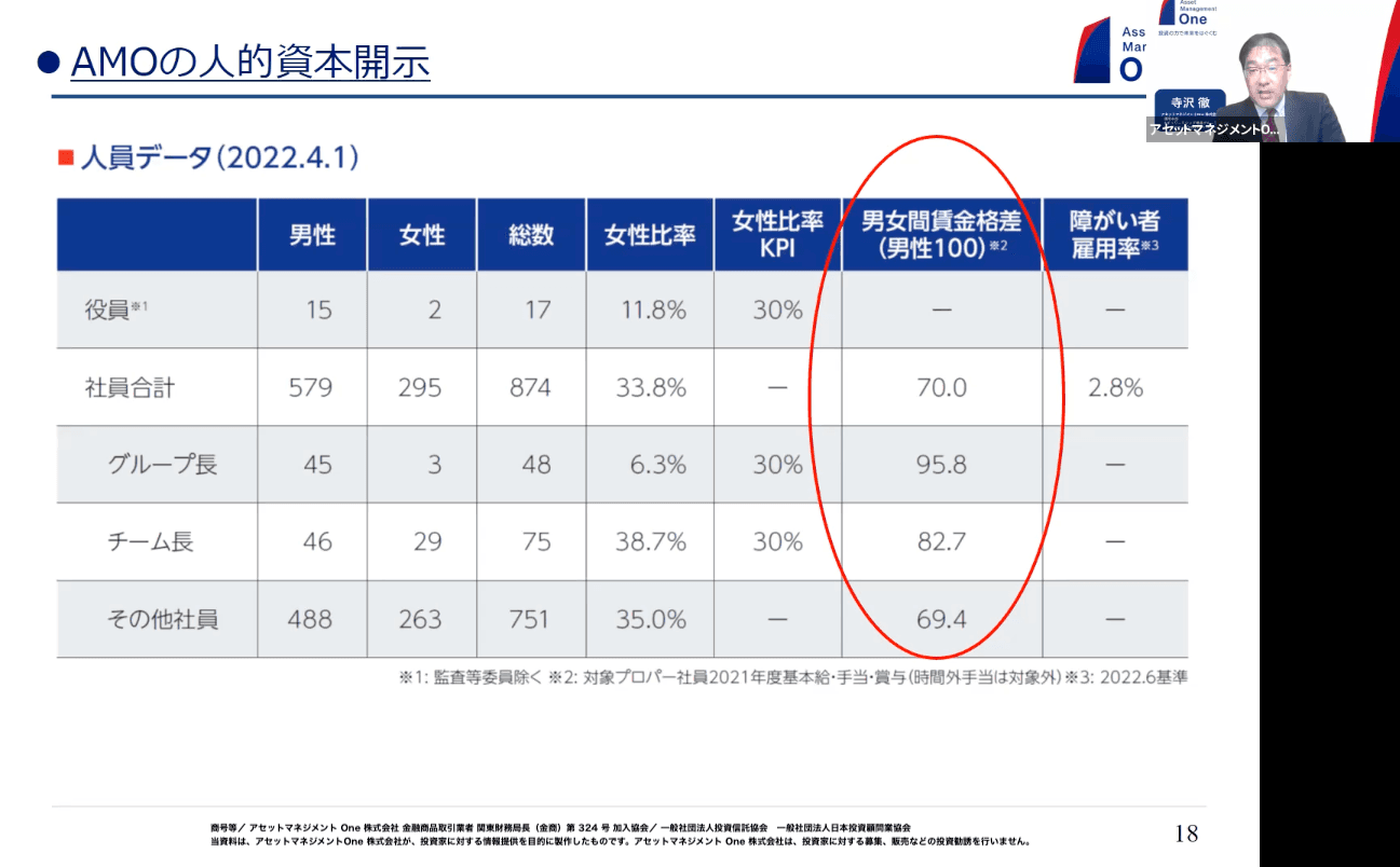 KPIについては、人的資本に関わるところで議決権行使の基準に入り始めているのは女性取締役の人数・比率だと思います。当社も今年度からプライム市場・全企業に対して、女性取締役を最低1人選任しないと必ず反対票を入れるというような基準を設けています。今の人的資本では、男女間賃金格差に反対票を投じると言った動きありますね。また、KPIとは別の話になりますが、過剰労働や、労働基準局が入り込んできたなどという人材絡み・働き方に関するような不祥事があった場合は、議決権行使をする際に反対票を投じることもあります。KPIからは少し逸れてしまいましたが、こういったところを意識されながらご開示いただくのがよろしいかなと思います。