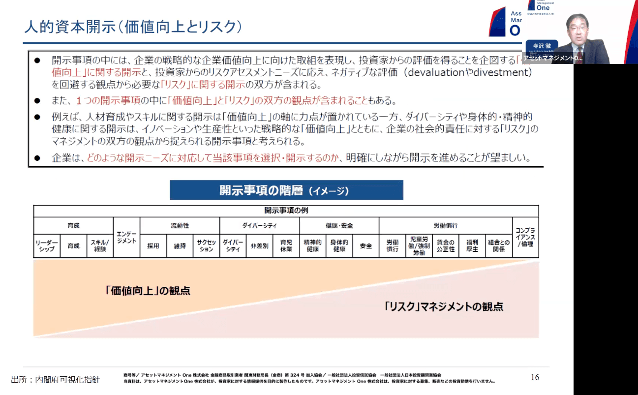 こちらは内閣府の可視化指針の大きなポイントとなる図です。リスクマネジメントの観点では、これを最低限やっていただきたいです。やらなければ企業の存続が危ぶまれる項目もありますし、企業価値向上の観点においてもこういった情報開示を進めることが必要です。じゃあアセットマネジメントOneはどうなの?というご質問をよく頂戴しますが、企業に取り組みをお願いしている限りは、我々も取り組みを進めていかなければいけません。完璧ではないですが、進めている姿をお見せしようとしているところで、社員のウェルビーイング、 働きがい向上の取り組みといったような形で様々な手を打っています。