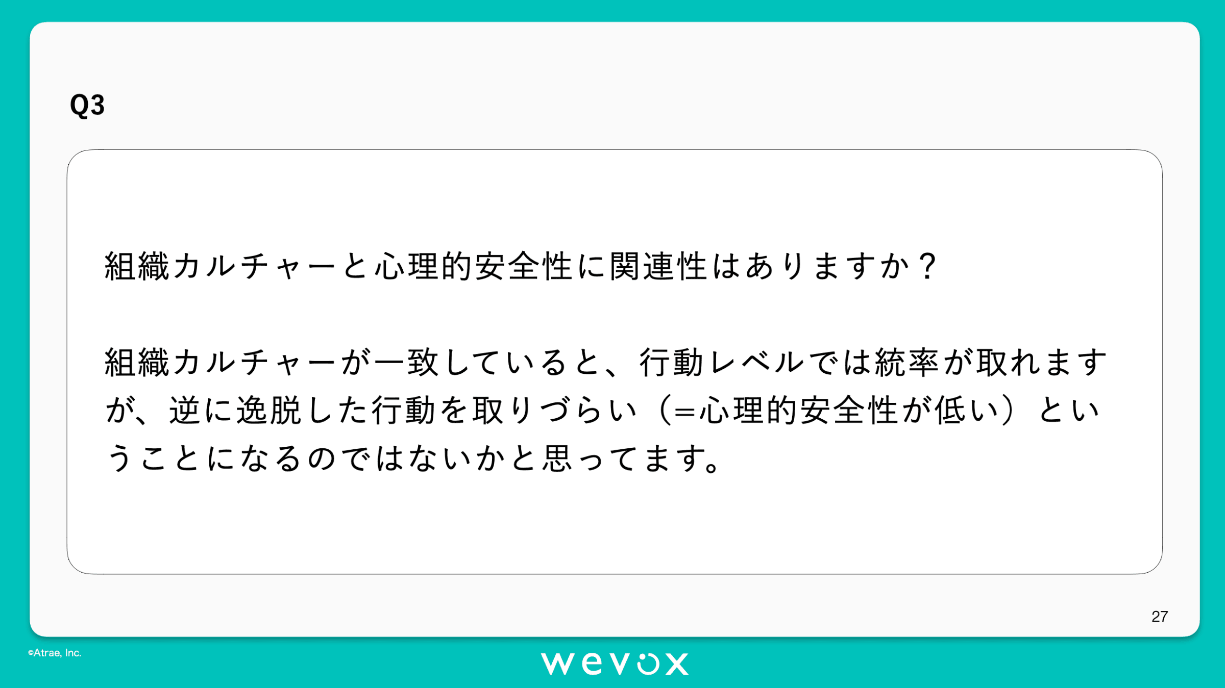 森山:次のご質問です。村瀬さんはエイミー・C・エドモンドソンさんの「恐れのない組織」(英治出版)を翻訳されています。先ほどあった、リーダーが一貫してカルチャーや行動基準を作っていく話と、心理的安全があるからこそ衝突を恐れずにいろいろな意見が出せるといった考え方は相反することなのかとも感じます。最近だと「まずは心理的安全性を大事にしなさい」といったことを口酸っぱく言われますので、リーダーシップや組織カルチャーと心理的安全性はどういう関係性なのかを、ご説明いただきたいです。