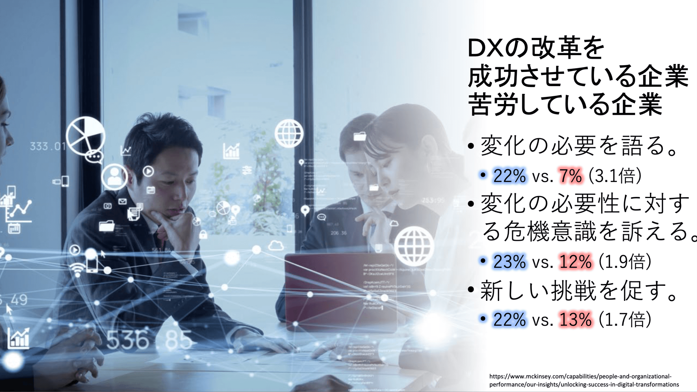 青ができている企業、赤ができていない企業を意味します。質問内容は、経営層やリーダー層が「変化が必要だ」とみんなに唱えているか、あとは「変わらなければいけない」という意識を高める発言や行動をしているかなどです。DXは大体3割以下の企業しか達成できないと言われています。つまり、100社の企業がトライしたら大体70社は失敗するというのが原理原則です。実際に、多くの経営者と話しても「3割も行けば良い方だ」と話しているのを耳にします。イノベーションや改革というもののデータを見てみても、3割以上を達成するということはないので、基本的には失敗が大前提になっているというわけです。