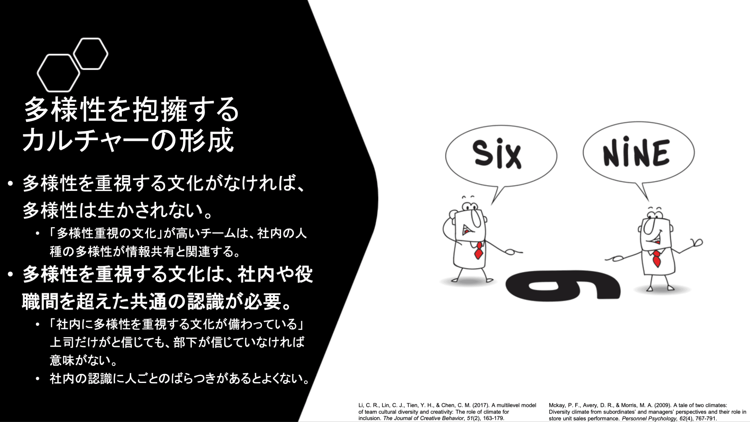 一方で、気をつけないといけないこともあります。いくら人事が頑張って「多様性を重要視しましょう」と言っても、上司が多様性のトレーニングを「面倒くさいけどHRがうるさいからとりあえずみんな受けといて」と言ってしまっていると、メンバーは「これってポジショントークなんだな」と感じてしまいます。仏像を彫って誰が魂を入れるかというときにリーダーが魂を入れないような発言をしてしまうと、それはあくまでオブジェとしてあるだけで、本当の仏様としては機能しません。