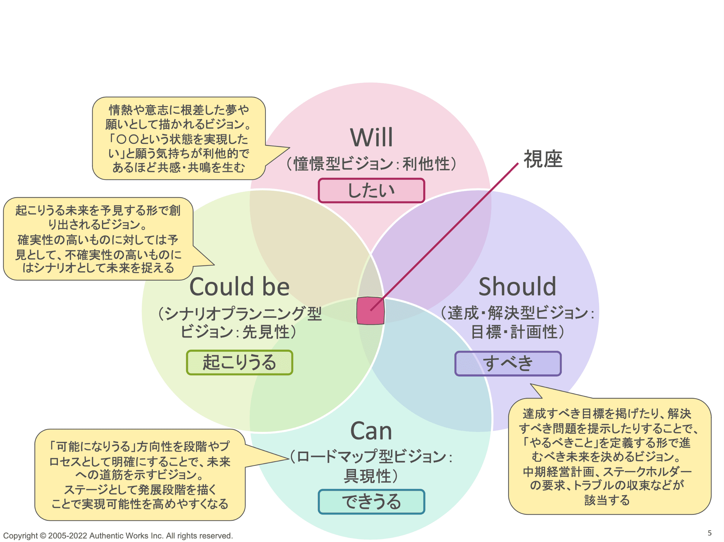 1つ目がWill型ビジョン。これは情熱や意志に根ざし、利他的な考え方で「こうありたい」というものを掲げるものです。2つ目がShould型ビジョン。中期経営計画に代表されるように、達せすべき目標、解決すべき問題を定義するものです。