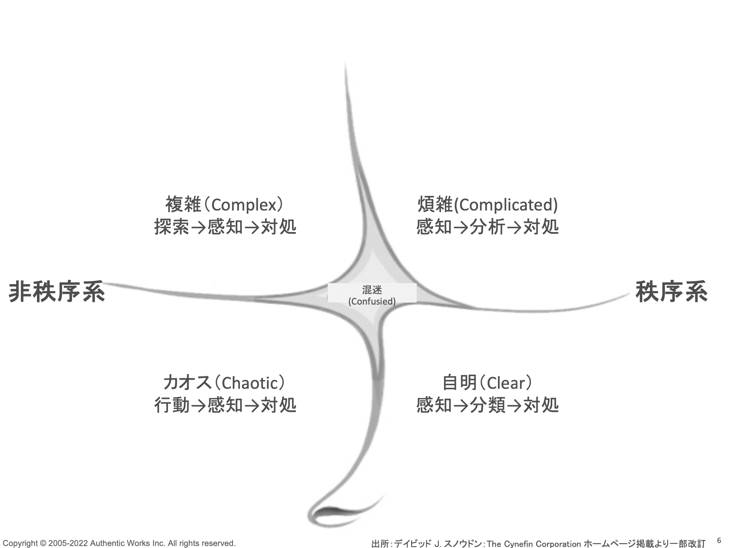 この図を見てください。これは、意志決定の種類を示すクネヴィン・フレームワークというものです。意志決定には4つの種類があり、大きくは秩序系と非秩序系に分かれていきます。先ほど言った「行動の前に計画がある」のは、右側の2つの意思決定のパターンです。つまり、これまでの企業は、この秩序系の意志決定を行っていたということです。秩序系というのは、正解が明確である、あるいは正解はいくつかあるが予測がしやすい意志決定の領域になります。