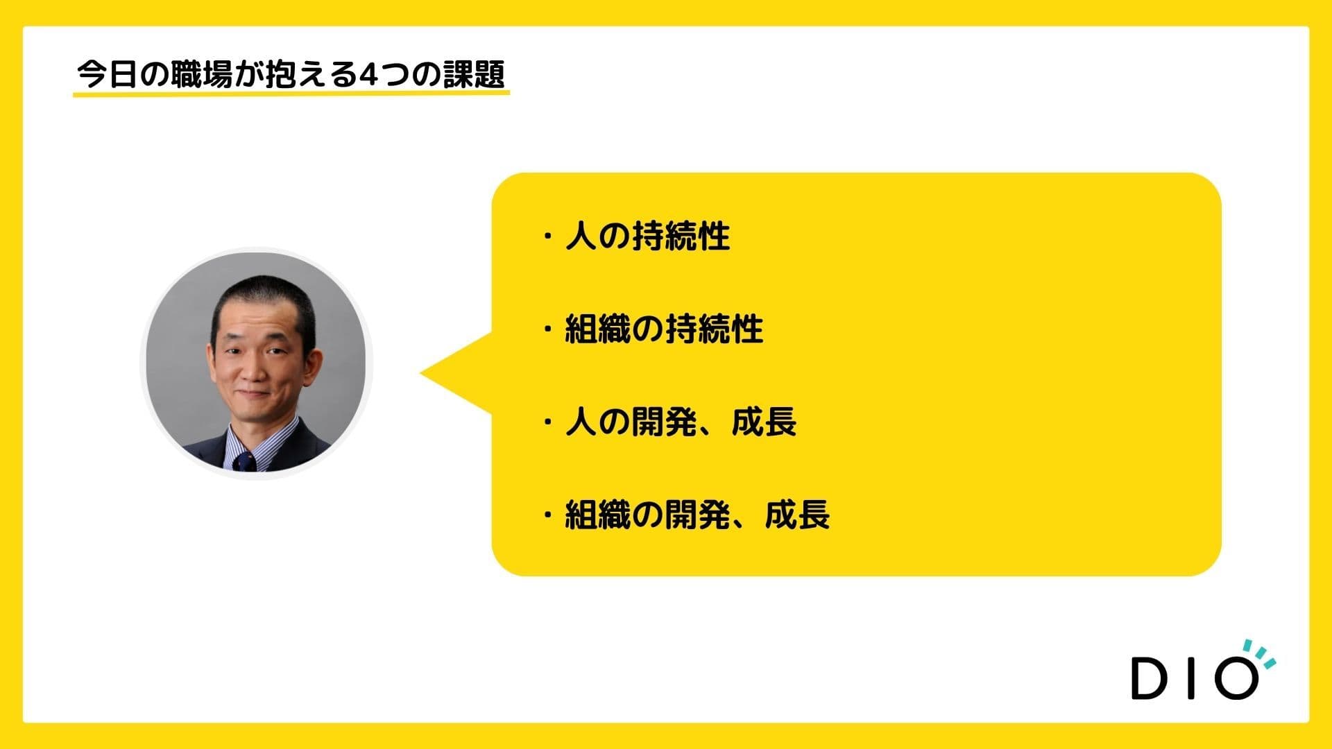 今日の職場が抱える課題として「人の持続性」「組織の持続性」「人の開発・成長」「組織の開発・成長」の4点が挙げられます。