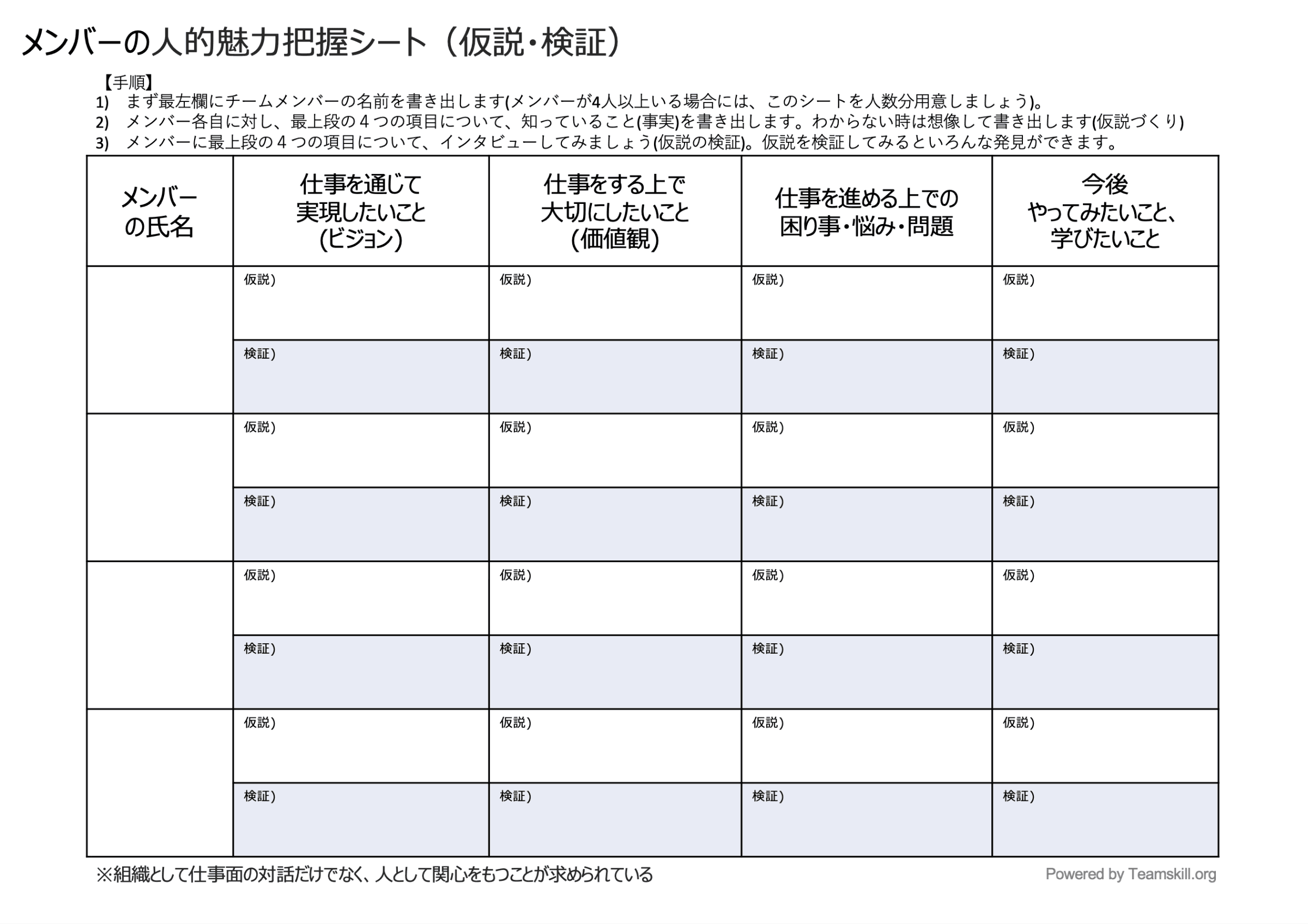 次いで、メンバー一人ひとりについて、右側にある4つの項目について、あなたが現在知っている事柄を書き出します。書き出す際に「本人から聴いて事実として知っている」場合は記入欄の(仮説)という記載を消し、「事実」と訂正して、知っている事柄を書き出します。事実として把握できていない事柄の場合は、仮説として、自分がいま想像できる範囲で「たぶんこう思っているだろう」「こういうことを大切にしているだろう」という仮説を書き出します。もし仮説も思いつかない場合はブランクのままで結構です。こうして名前を記載したメンバー全員について、すべての事柄について事実または仮説を書き出してみます。