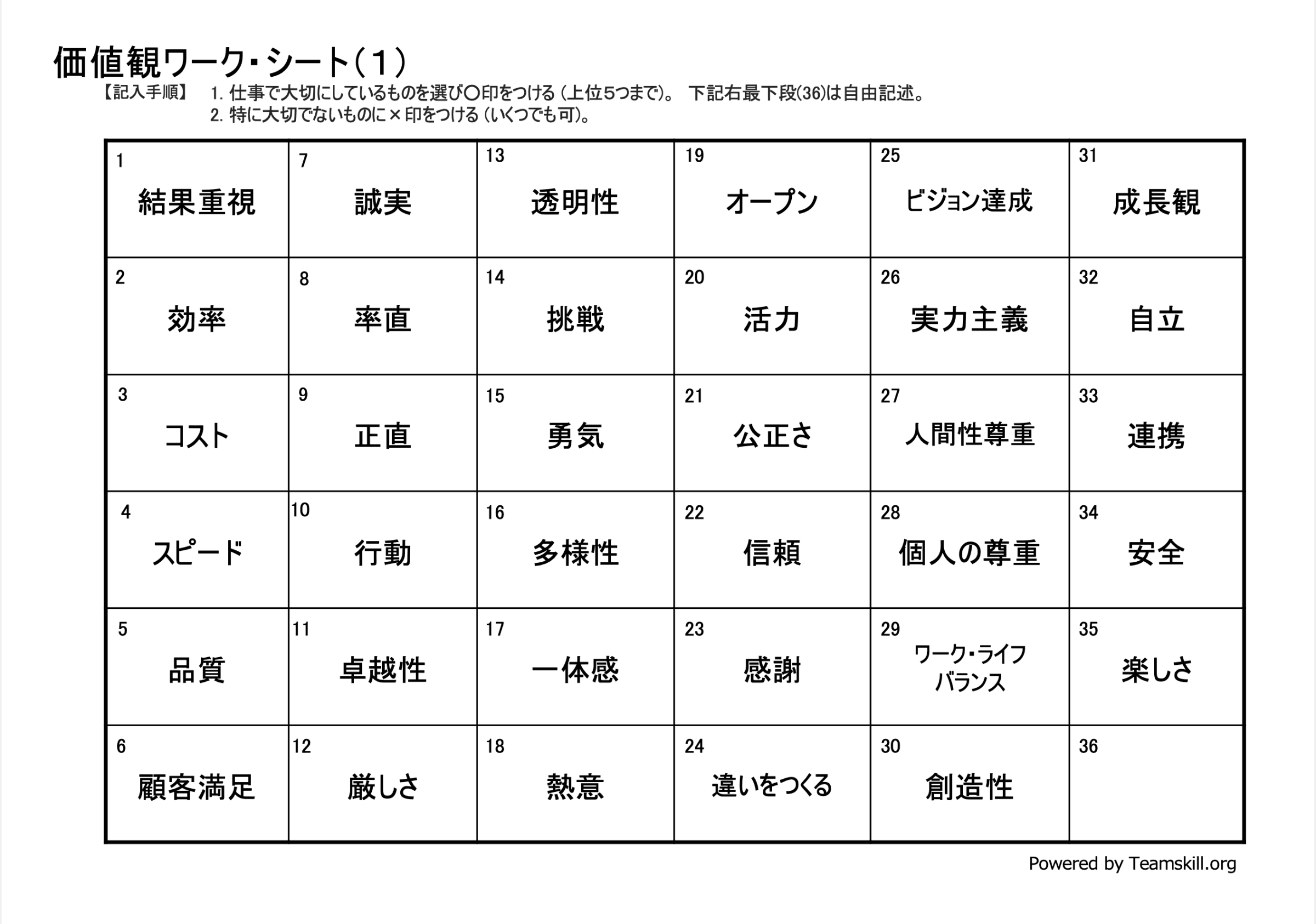 (2) もし該当する言葉がなければ36番の欄に自分の大切にしていること(言葉やポンチ絵など、複数可)を記述します。