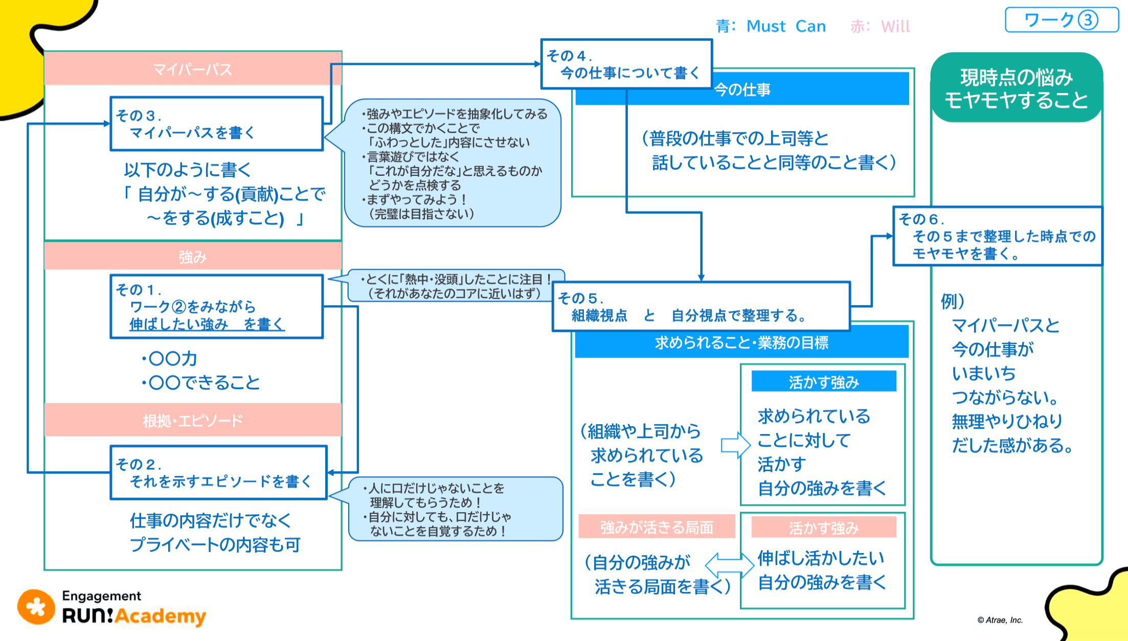 を具体的に深掘り、言語化することで、自分の価値観や意欲の源泉を見つけることが目的です。