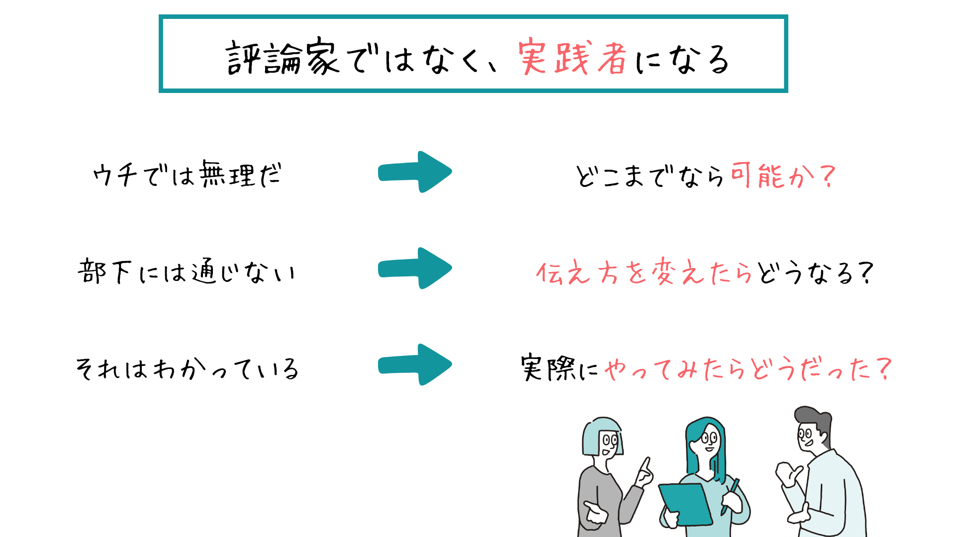 頭でっかちになり、「それはわかっている」「ウチの会社では無理だ」「あの部下には通じない」と評論家になってはいけません。「これを試したらどうなるだろう?」「うまくいかなかったら、次はこうしてみよう」。そうした仮説検証のサイクルを回し続けることだけが、マネジメントスキルを血肉に変えていきます。