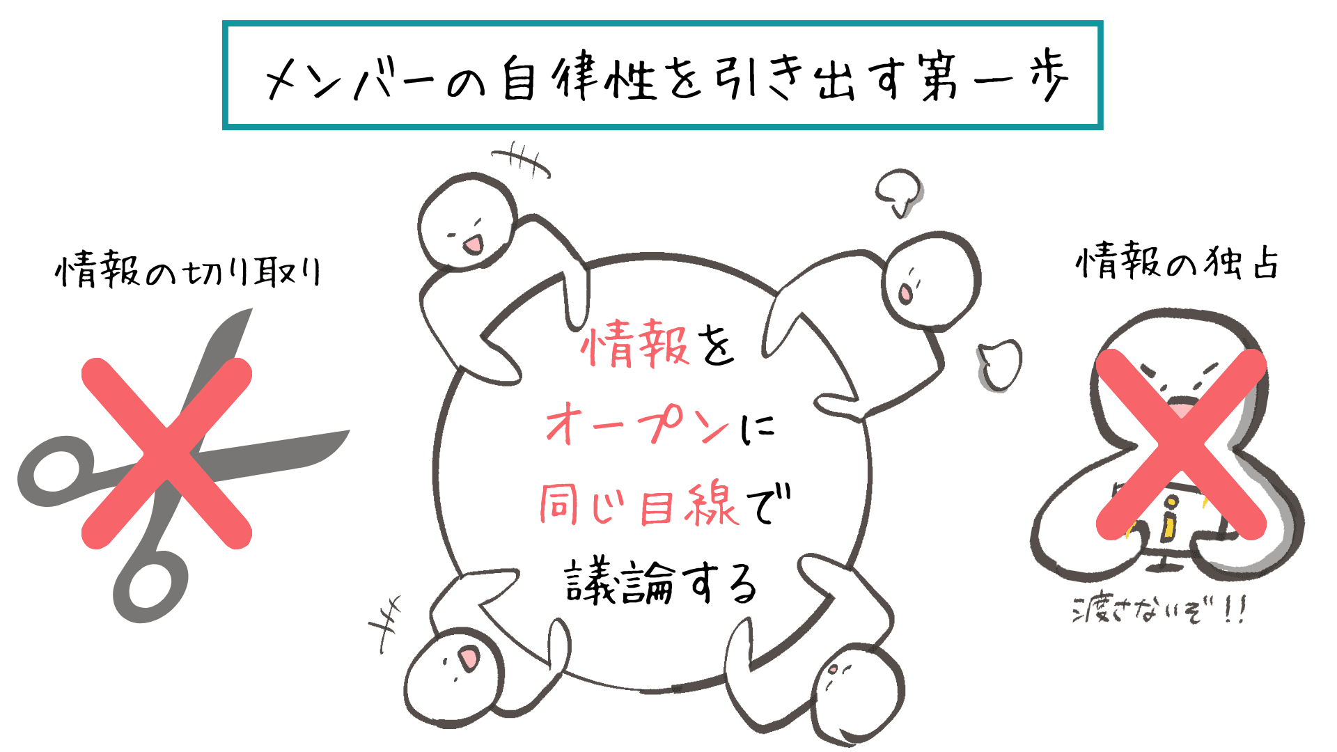 必要なのは、上から降りてきた情報を、生のままメンバーに展開すること。「情報を隠してコントロールする」のではなく、「情報をオープンにして、同じ目線で議論する」。これがメンバーの自律性を引き出す第一歩です。