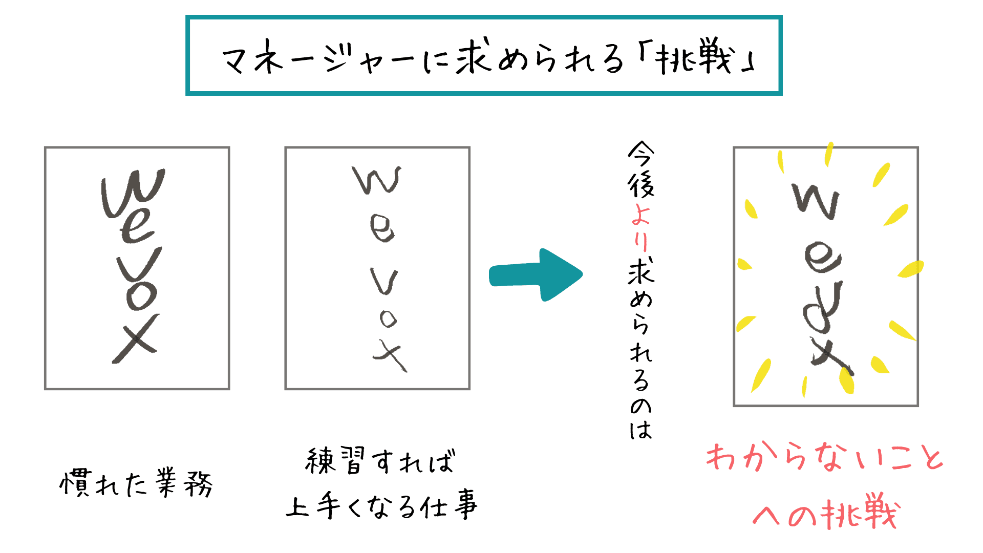 そして3つ目の「目を閉じて書く」行為。これこそが、これからのリーダーシップに求められる「やってみないとわからないことへの挑戦」です。