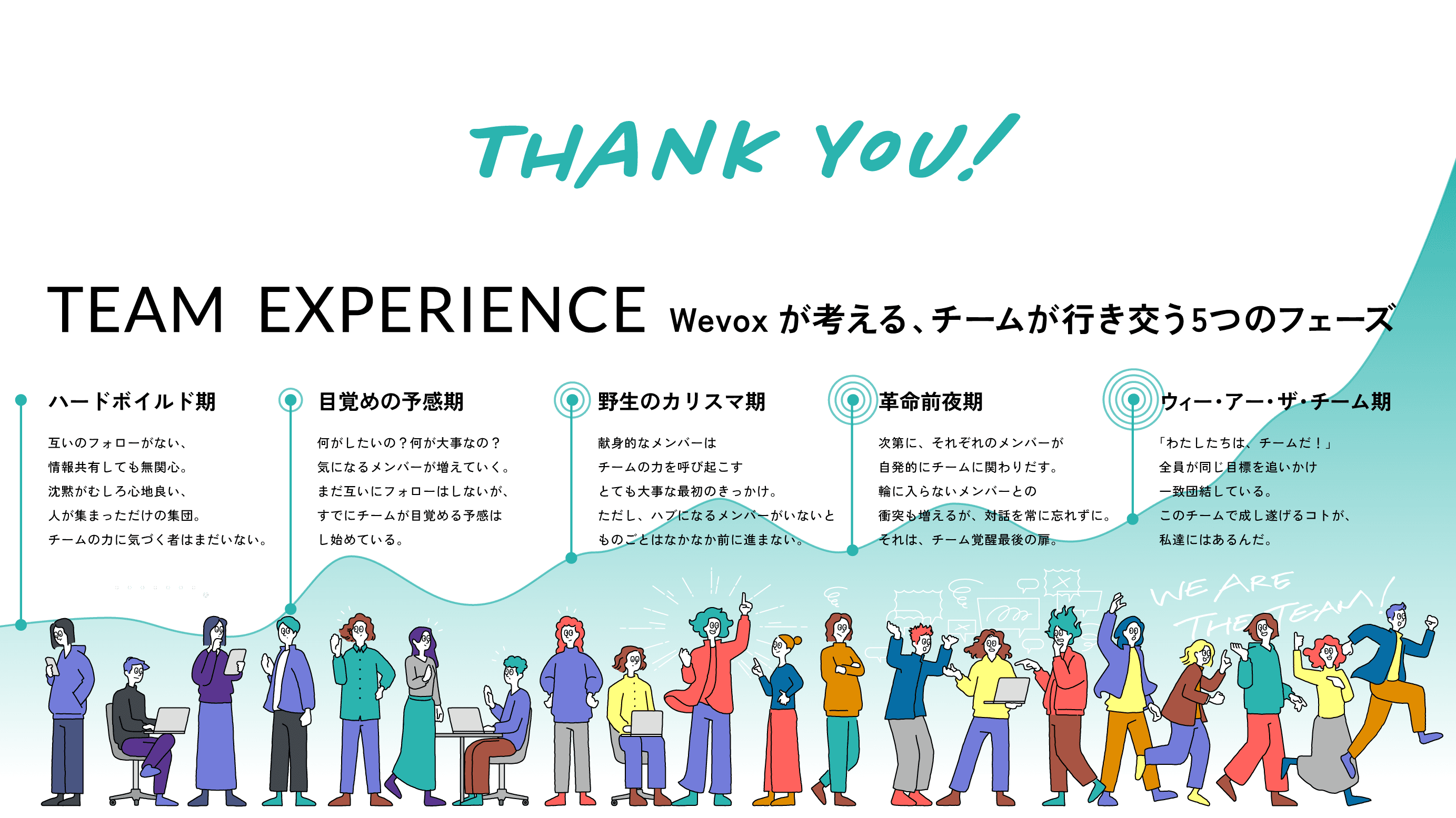 本コラムで解説したマネジメントを実践し、チームにいい変化を生み出していきましょう。Wevox、マコさんの共同著書「わたしたちのエンゲージメント実践書」では、チームの変化を5段階の「TEAM EXPERIENCE」として掲載しています。