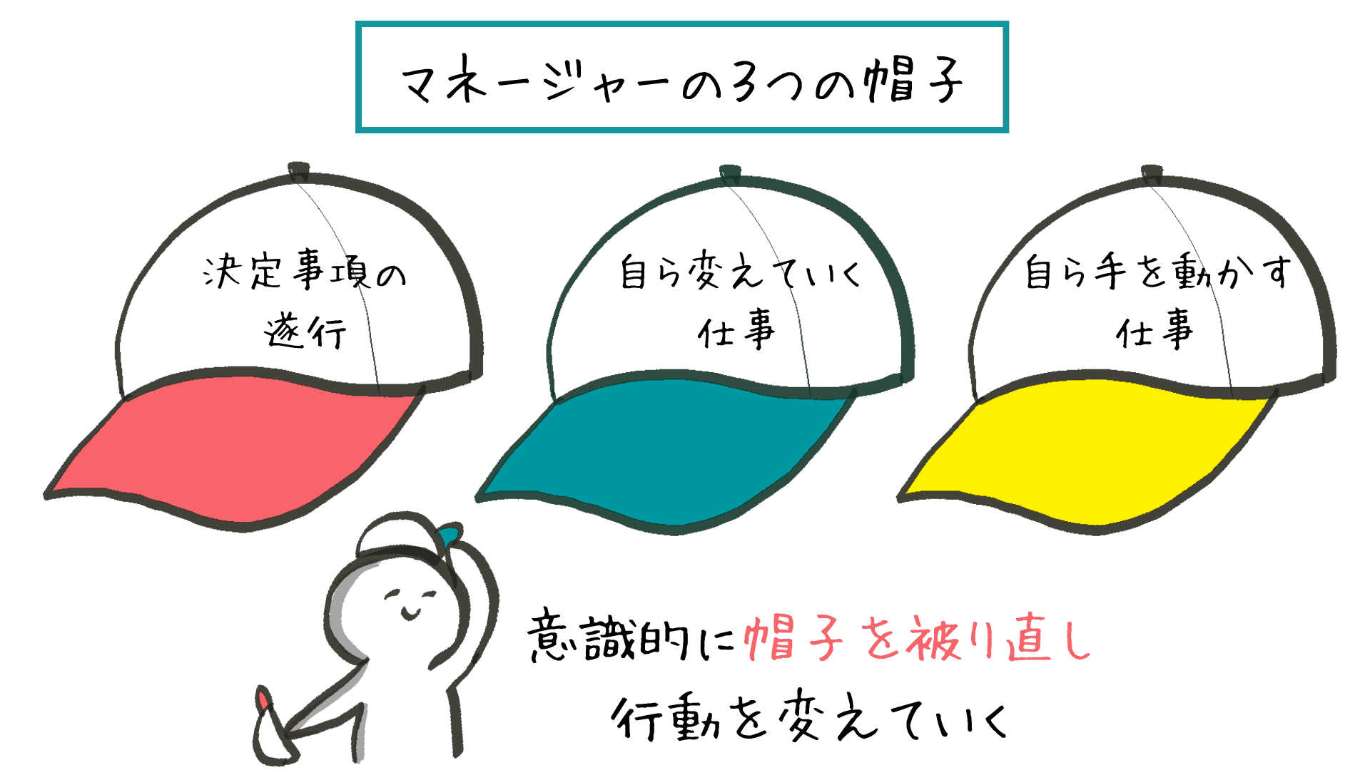 みなさんの仕事には、「(チームで)すでに決まっていることを粛々と実行する仕事」と、「意思を持って変えていく仕事」、そして「自らが手を動かす仕事」の3つが混在しています。まずはご自身の業務を棚卸しし、今どの帽子をかぶっているのかを意識的に区別して行動を切り替えることから始めてみてください。