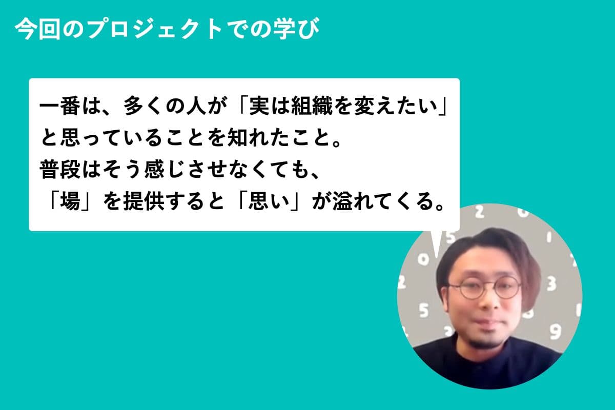 そうですね。最初に組織の課題を見つけようとしたあたりで、それまでとは変えて実名での実施にしたんです。誰がどういう意見を持っていて、何に課題意識があるのかを知るうえではすごく参考になりました。