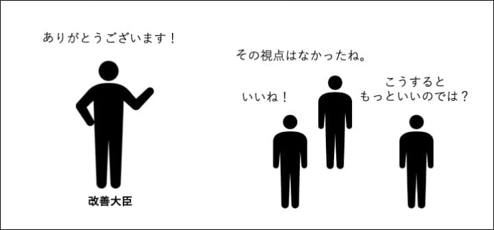 改善案に対して、メンバーそれぞれの意見を発表してもらいましょう。改善案そのものに対しての意見はもちろん、作成の間での気付き、改善大臣の動き方などへのフィードバックもあるとよいでしょう。